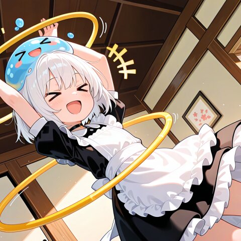 1 little girl, solo, diagonal angle, masterpiece, best quality, amazing quality, very aesthetic, white hair, short hair, > <, open mouth, smile, cheerful, +++, notice lines, choker, maid outfit, long sleeves, long skirt, slime on her head, > <, compact car, kei car, nissan, tall car, hatchback, small vehicle, boxy vehicle, sitting on car roof, spring \(season\), cherry blossoms,