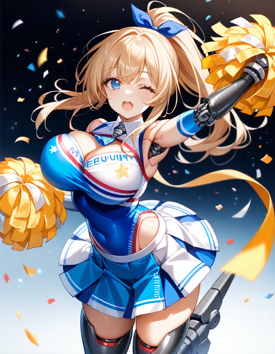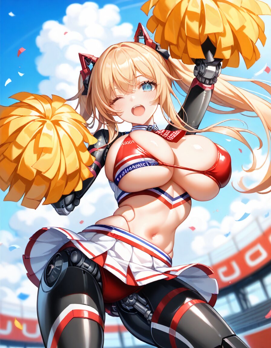 masterpiece, high quality, solo, 1girl, cowboy shot, smooth skin, mecha musume, mechanical arms, mechanical legs, large breasts, doll joints, open mouth, one eye closed, arm up, cheerleader, pom pom \(cheerleader\)