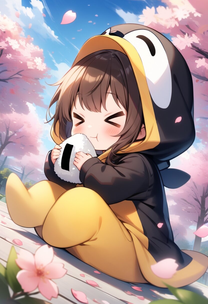 1girl, solo, chibi style, (looking away), sidelocks, short hair, brown hair, closed eyes, :d, cosplay, bird, ((>_<)),smile, blush, animal costume, emperor penguin, penguin hood, hood up, onigiri, :t, eating, holding food, outdoors, sitting on blue vinyl sheet, cherry blossom ornament, (cherry blossom pattern), (petals:1.3), wind, sky, outdoors, from side, from below, full body,