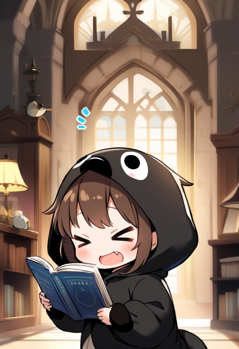 1girl, solo, chibi style, sidelocks, short hair, brown hair, closed eyes, :d, cosplay, bird, ((>_<)), blush, cosplay, animal costume, emperor penguin, penguin hood, hood up, open mouth, :3, fang, at noon, indoors, castle, lamp, (looking down:1.4), reading books, (+++), from side,