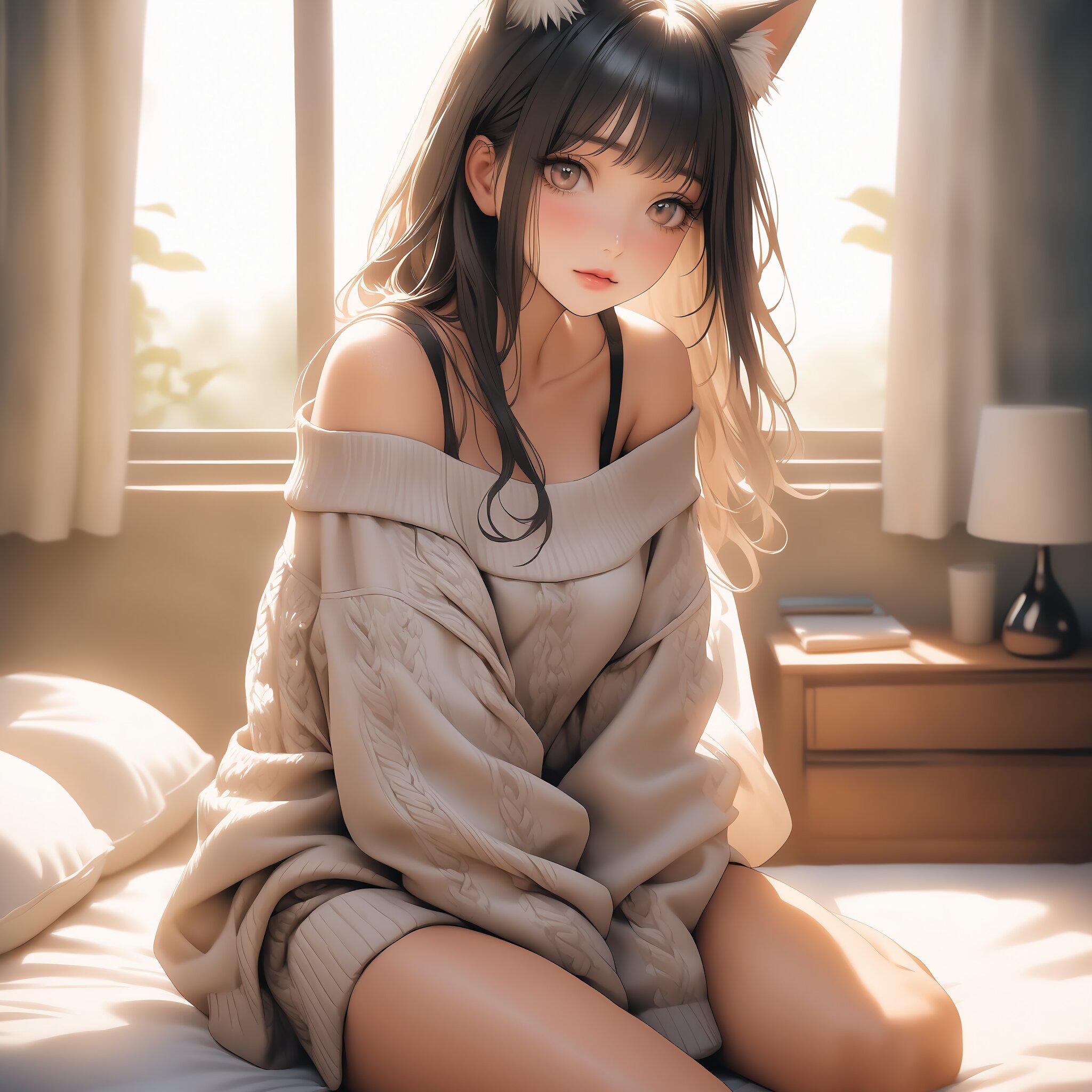 Masterpiece, alluring cat-eared girl in a modern sunlit bedroom, wearing only an oversized off-shoulder beige knit sweater, showing smooth pale shoulders and long legs. Fluffy cat ears matching her messy bedhead hair, sitting on white messy bedsheets, stretching her body, sultry and sleepy expression looking at the viewer. Soft morning sunbeams filtering through the window, warm and intimate atmosphere, shallow depth of field, highly detailed skin texture, realistic anime style, 8k.