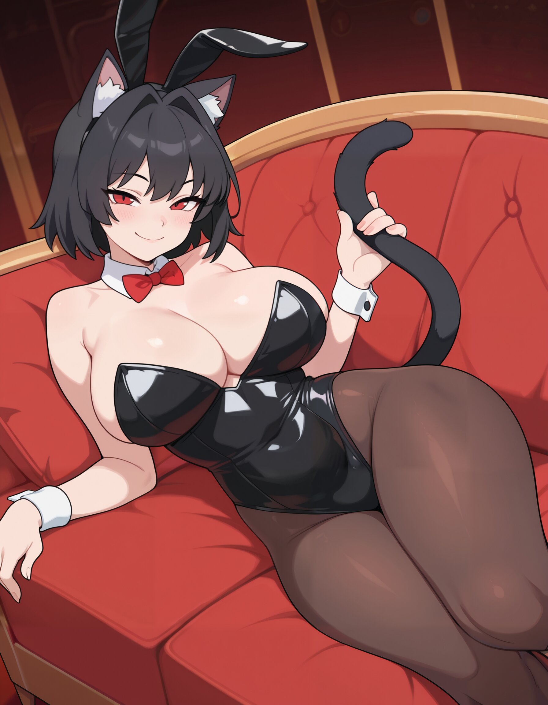 1girl, solo, breasts, looking at viewer, smile, short hair, large breasts, black hair, red eyes, bow, animal ears, closed mouth, cleavage, bare shoulders, tail, pantyhose, bowtie, cat ears, rabbit ears, red bow, leotard, animal ear fluff, cat tail, wrist cuffs, strapless, fake animal ears, detached collar, playboy bunny, black leotard, red bowtie, strapless leotard, couch, on couch
