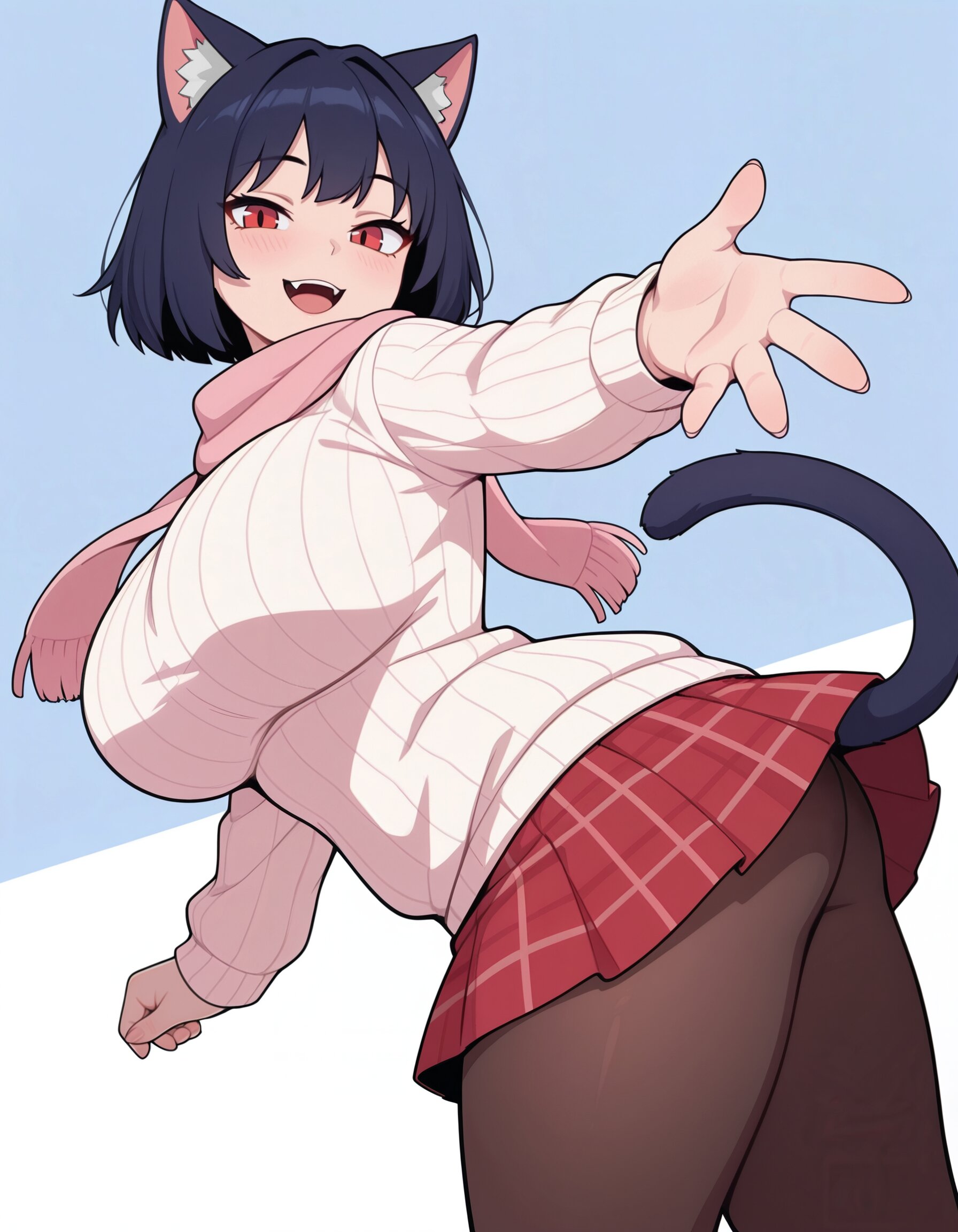 1girl, solo, breasts, looking at viewer, smile, short hair, large breasts, skirt, black hair, red eyes, animal ears, tail, pantyhose, cat ears, scarf, sweater, cat tail, cat girl, white sweater, pink scarf