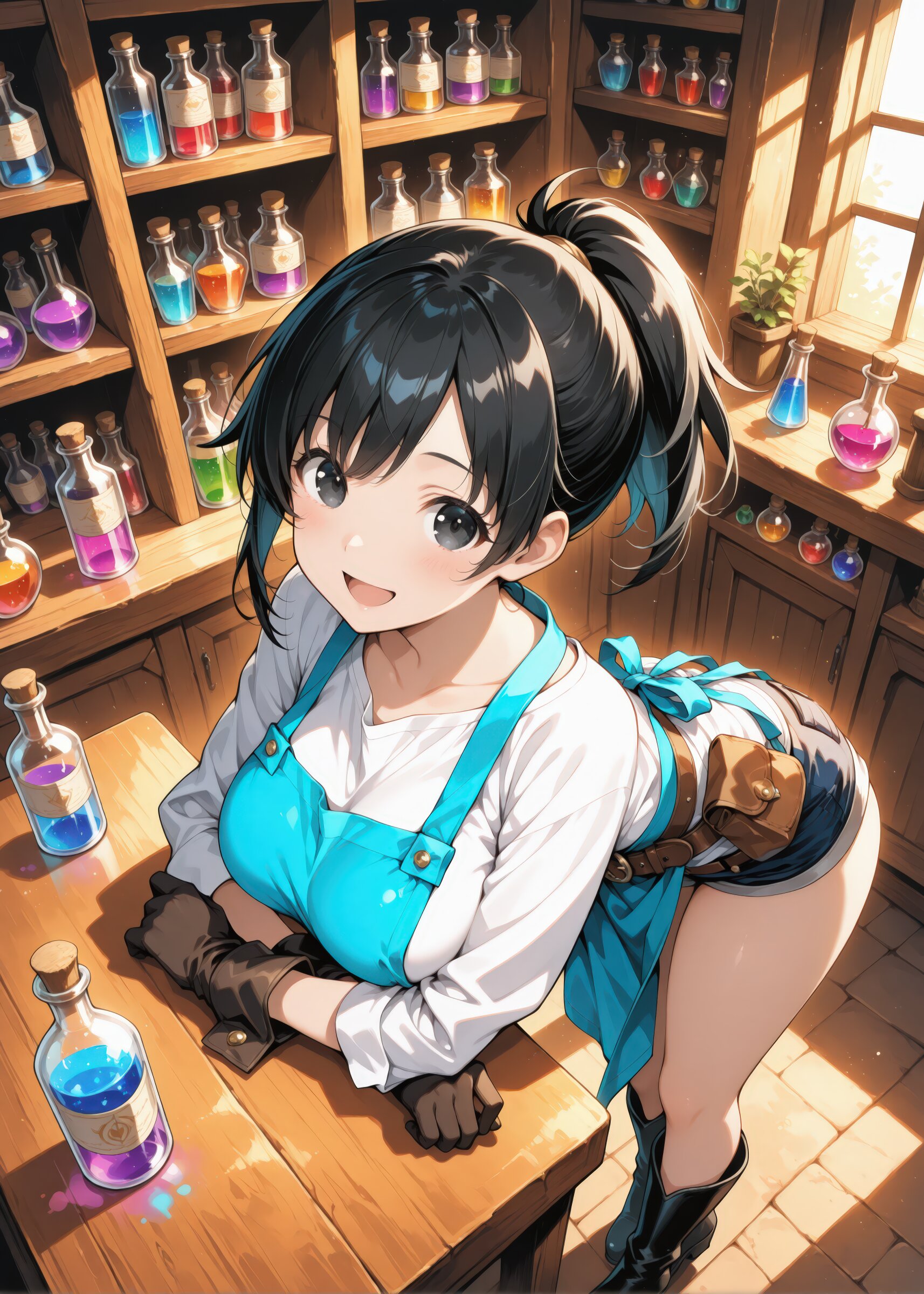 masterpiece, best quality, (fantasy style:1.2), animestyle illustration, ,8k, beautiful and aesthetic:1.2, professional illustrasion:1.1, ultra detail:1.3, perfect lighting, extremely detailed, highest detailed, incredibly absurdres , highres, ultra detailed,intricate:1.6,1girl, (young girl), cute face and eyes, big breasts, black hair, clear black eyes, single short ponytail hair, cute and lovely, Vigorous, lively, and spontaneous personality , alchemist, ((Thin blue apron:1.4)), (gloves to the cuffs), ((pockets:1.1)), ((belt pouch filled:1.4)), (Salwar Kameez:1.2), (black boots:1.1), (short shorts:1.4), smile, open mouth, in the Alchemy Shop,, Alchemy Lab, from above, negative space, dutch angle, looking at viewer, opposing sides, elbows on table, Potion bottles, herbs, and magical items, all in a rainbow of colors, lined the shelves,