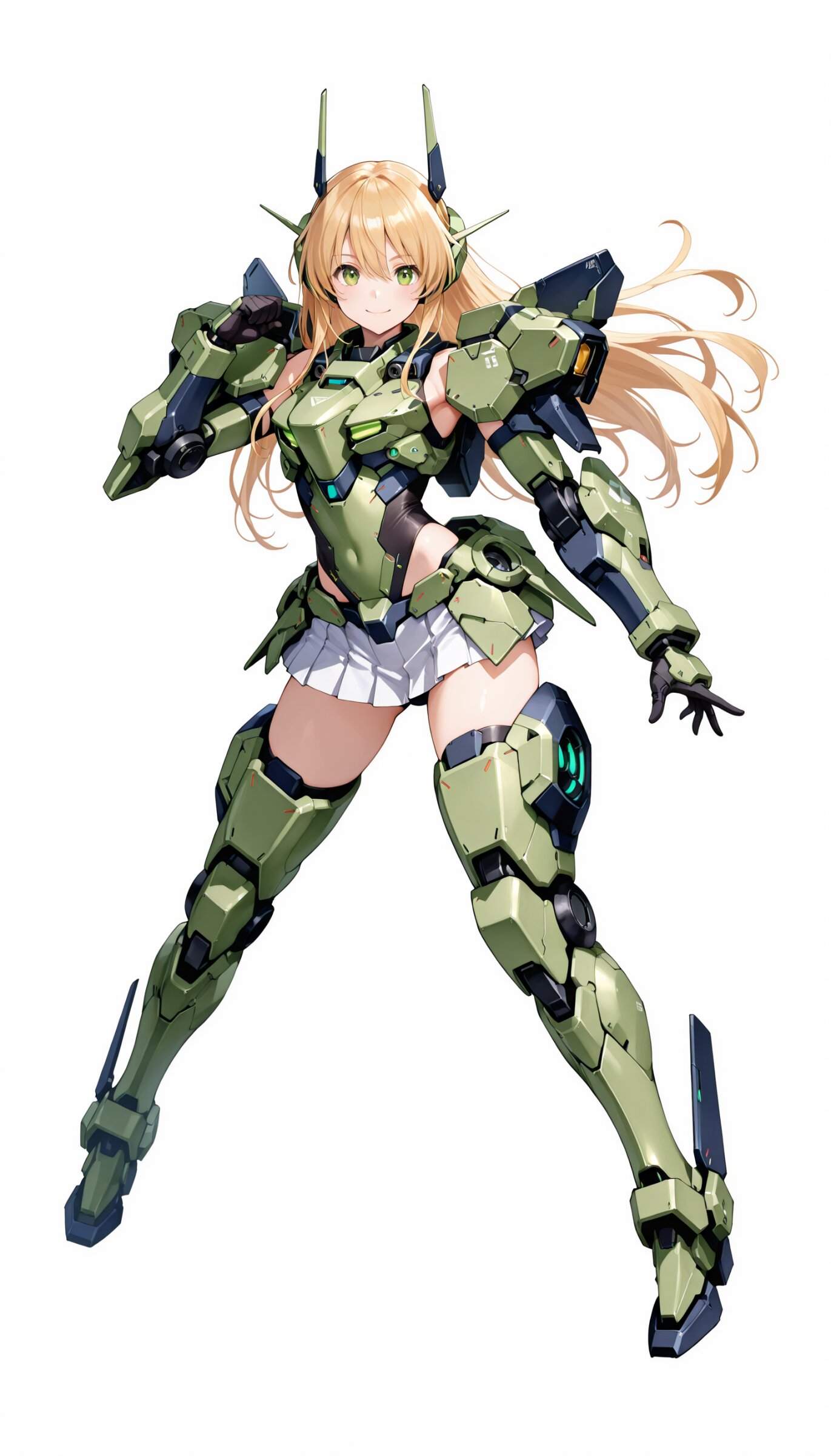 1girl, ((white background)), ultra detailed 8k cg render, masterpiece, high resolution, extremely detailed, mecha musume,mecha shoulder, mech leg, headgear, mecha armor, ((mini skirt)),long blonde hair, dropping green eyes, smile, dynamic posing,