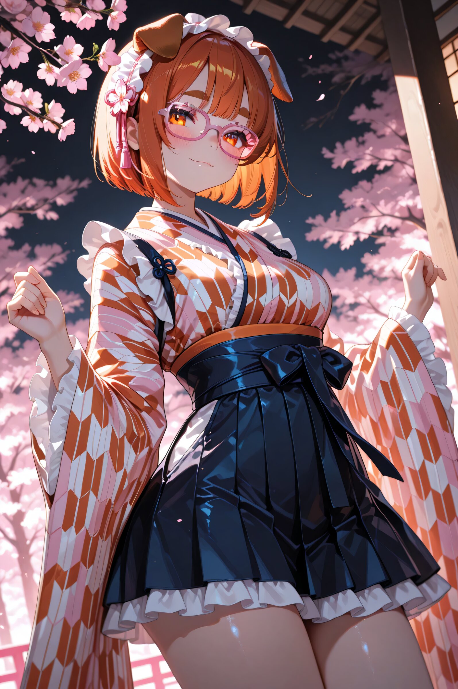 absurd, high definition, masterpiece, Highest Quality, great quality,ultra-detailed.cinematic angle,soft shadows,beautiful lighting. 1 girl, solo,"Chieko",standing,cowboy shot.dark orange hair,short bob hair,hair bang,dog ear headband and black color,white head dress,cute face,pink frame glasses,orange eyes,seductive smile,blush,healthy skin,thick eyebrows;frilled kimono with Beige yagasuri pattern,navy mini skirt with white frill,yokozuwari, w arms,beautiful legs.;Row of cherry blossom trees,night
