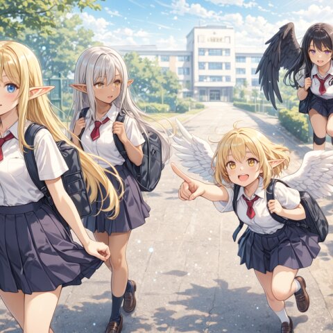 (Ultra-wide angle, cinematic horizontal composition. A beautiful and brave elven girl with blonde hair and blue eyes, wearing primitive leather clothing, is riding on the back of a giant Pteranodon, gliding through the vast sky. Her hair flows in the wind, and a primitive jungle and sea of clouds stretch out beneath her. The setting sun shines through the pterosaur's wing membranes, creating divine backlighting (lens flare). Dynamic angle, fantasy art style, high resolution, masterpiece.), anime style, anime color,, <lora:elf-san_alpha1(AnimagineV31):0.7> <lora:elf-san_alpha4(IL1.0):0.7>, soft lighting, rim lighting, volumetric light, lens flare, bokeh, ((Countless light particles floating around)), nice hand, perfect hand, perfect anatomy, five-finger,, kawaii, adorable, cute, elf girl, (apatite eyes with CGI effect), (deep blonde hair:1.2), medium breasts, wide hip,