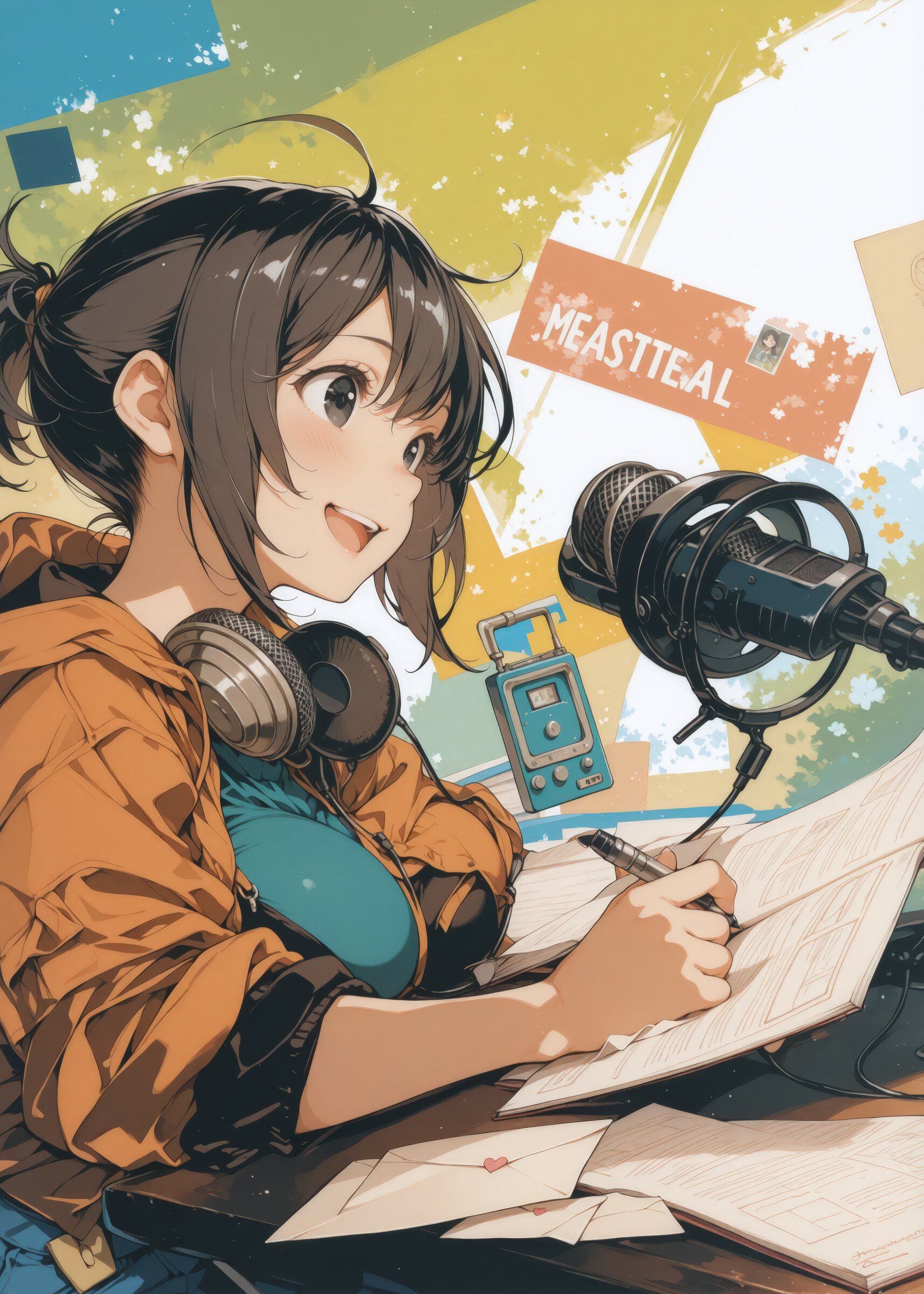 Masterpiece, assemblage, conceptual art, flat design, message, narrative, japanese manga style, picture book style, A girl, a radio personality, reading a letter and speaking into a microphone. 1girl, (young girl), cute face and eyes, big breasts, black hair, clear black eyes, single short ponytail hair, cute and lovely, Vigorous, lively, and spontaneous personality, smile, open mouth, talking, holding pen,