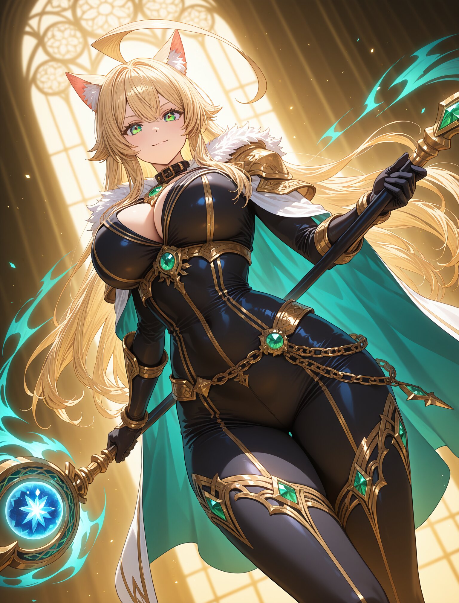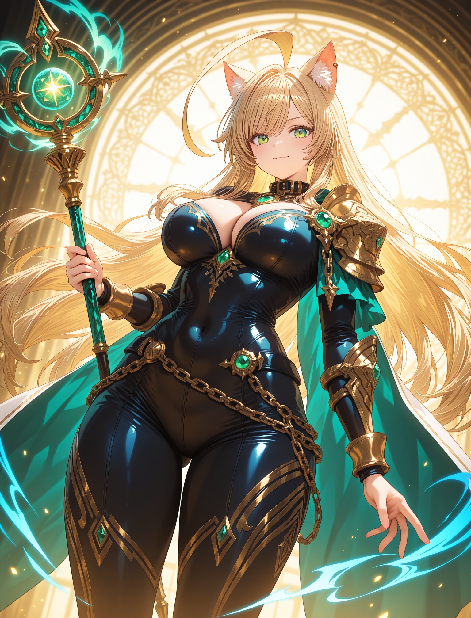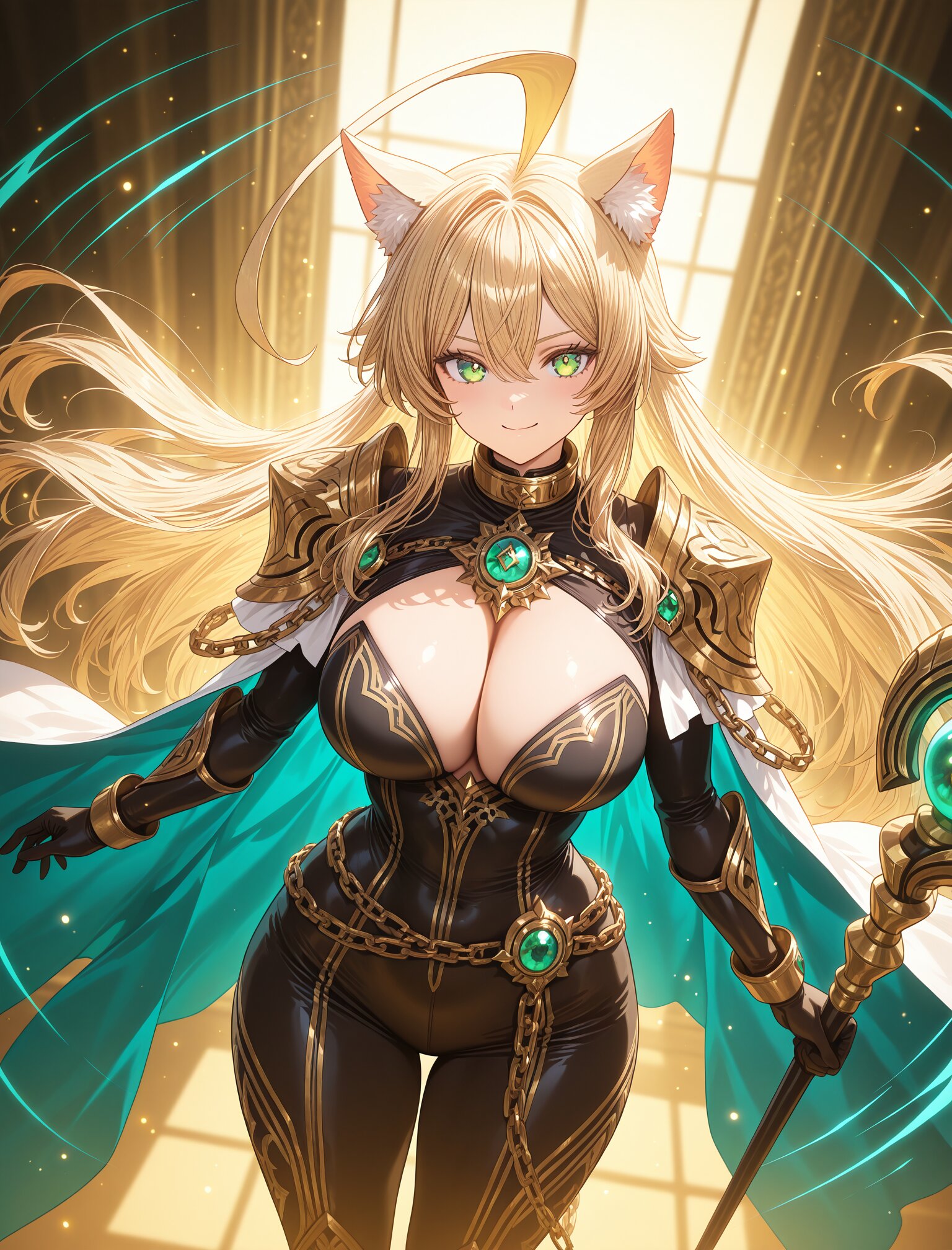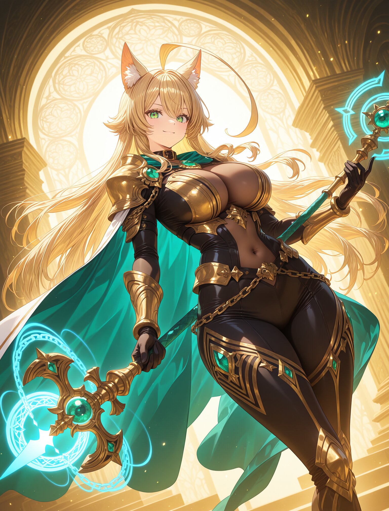 (long blond hair),(huge ahoge:1.8),(,large breast),(huge hips),(collar),(calm smile:1.3),(uopper body:1.5),(green eyes) girl, female protagonist, wolf ears, golden hair, long flowing hair, blonde hair, red piercing eyes, armor, leather bodysuit, fur accents, gold accessories, serious expression, confident look, cape, jewel-encrusted brooch, chain details, ornate staff, magical weapon, embedded gemstones, intricate carvings, standing in a heroic pose, holding staff with both hands, magic particles, glowing effect emanating from staff, swirling magical aura, fantasy setting, ethereal golden light, swirling energy lines, golden and teal hues, warm tones with dynamic lighting, sparkles, radiant beams, layered magical effects, anime-style illustration, hand-drawn fantasy art, close-up shot, dynamic angle, highly detailed, vibrant colors, intricate shading, fantasy RPG poster-like aesthetic, (dynamic angle:1.6),masterpiece,best quality,very aesthetic, <lora:StS-Illustrious-Detail-Slider-v1.0:2.> <lora:sdxl-hairdetailer_02:2>