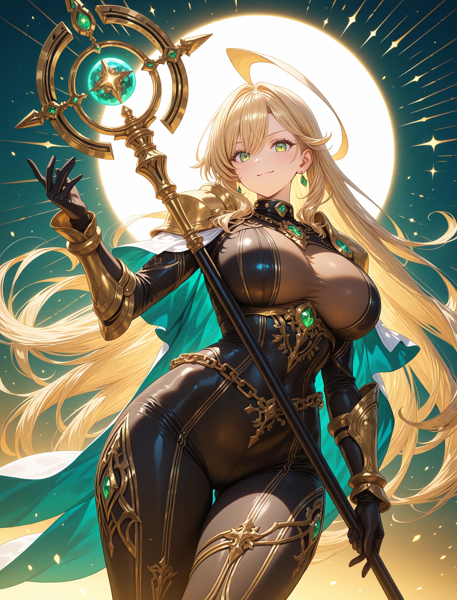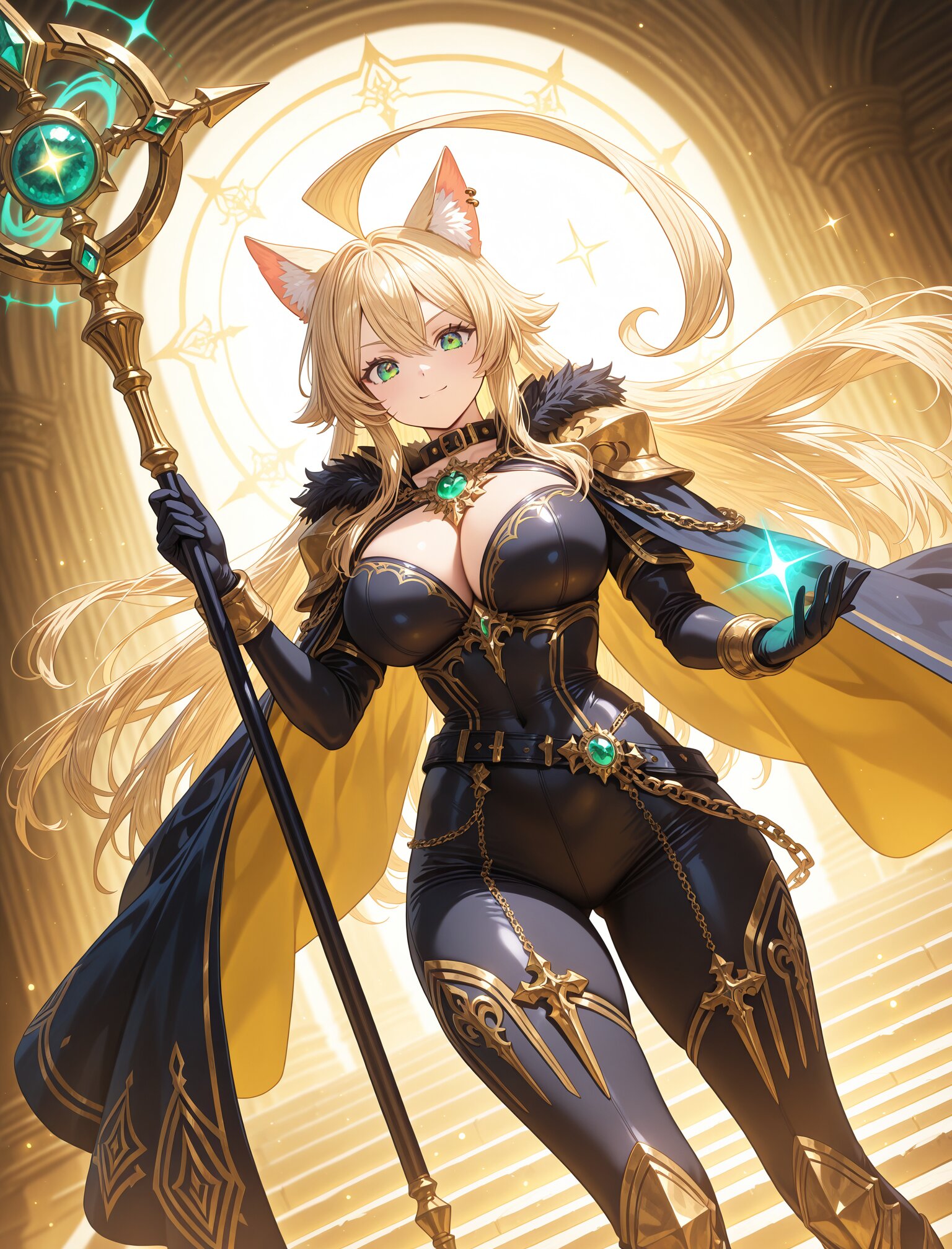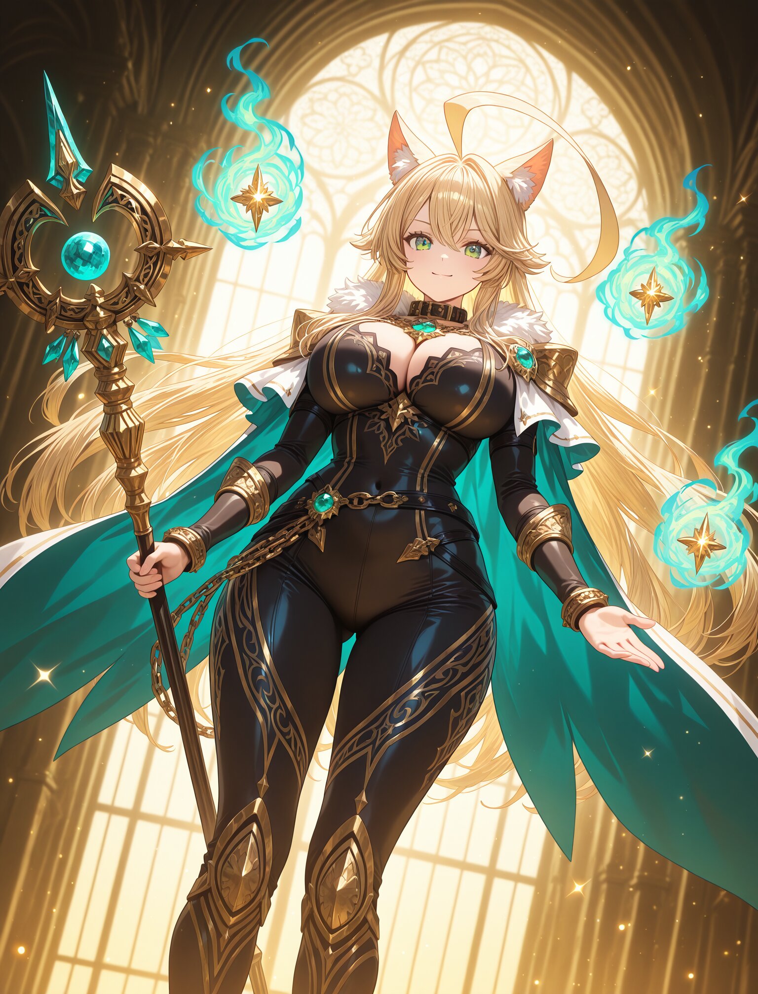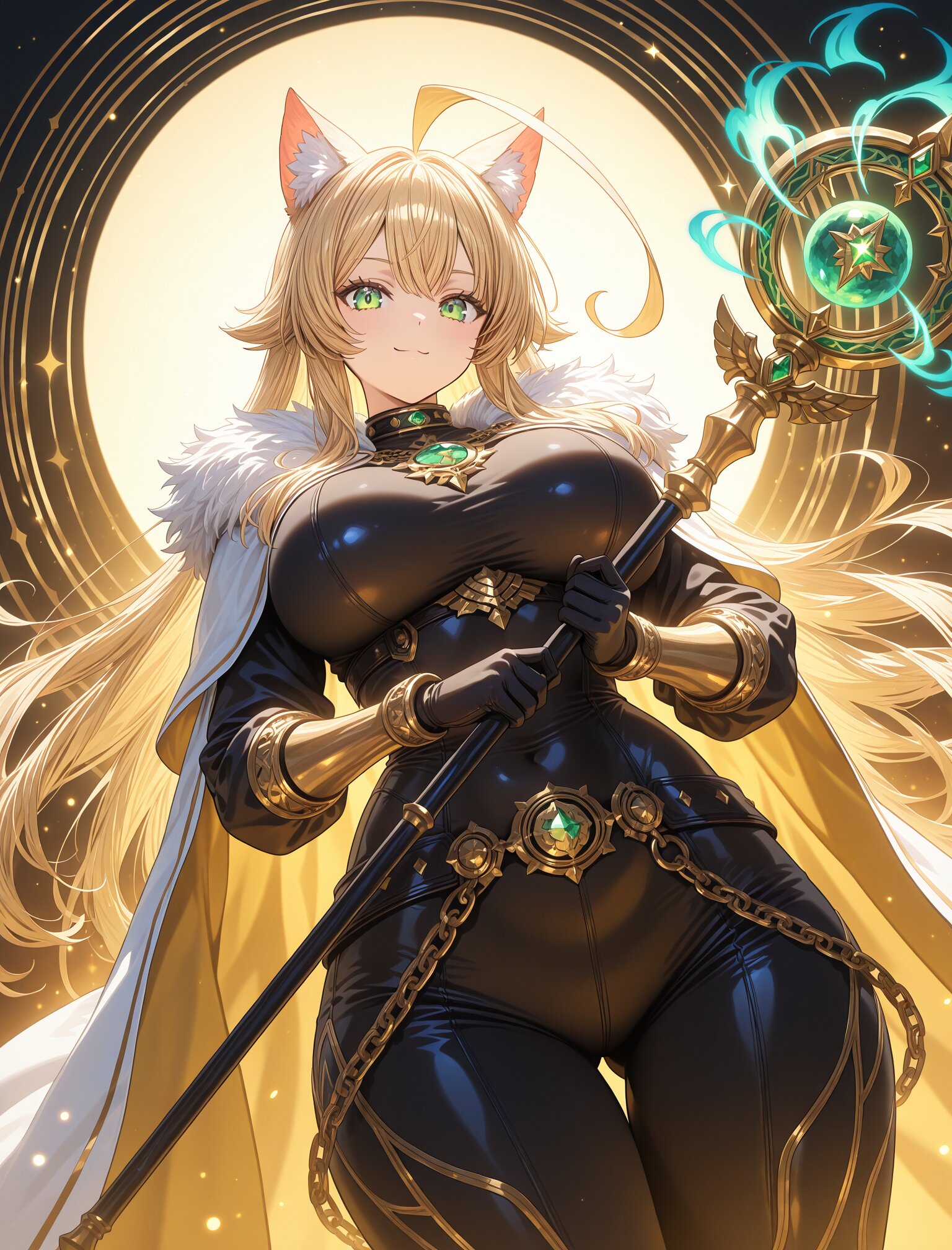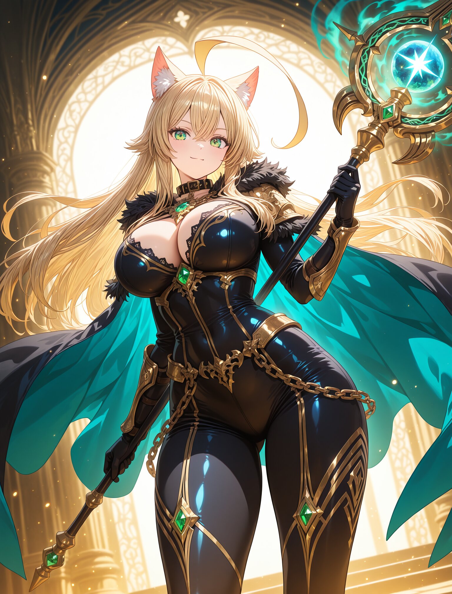(long blond hair),(huge ahoge:1.8),(,large breast),(huge hips),(collar),(calm smile:1.3),(uopper body:1.5),(green eyes) girl, female protagonist, wolf ears, golden hair, long flowing hair, blonde hair, red piercing eyes, armor, leather bodysuit, fur accents, gold accessories, serious expression, confident look, cape, jewel-encrusted brooch, chain details, ornate staff, magical weapon, embedded gemstones, intricate carvings, standing in a heroic pose, holding staff with both hands, magic particles, glowing effect emanating from staff, swirling magical aura, fantasy setting, ethereal golden light, swirling energy lines, golden and teal hues, warm tones with dynamic lighting, sparkles, radiant beams, layered magical effects, anime-style illustration, hand-drawn fantasy art, close-up shot, dynamic angle, highly detailed, vibrant colors, intricate shading, fantasy RPG poster-like aesthetic, (dynamic angle:1.6),masterpiece,best quality,very aesthetic, <lora:StS-Illustrious-Detail-Slider-v1.0:2.> <lora:sdxl-hairdetailer_02:2>
