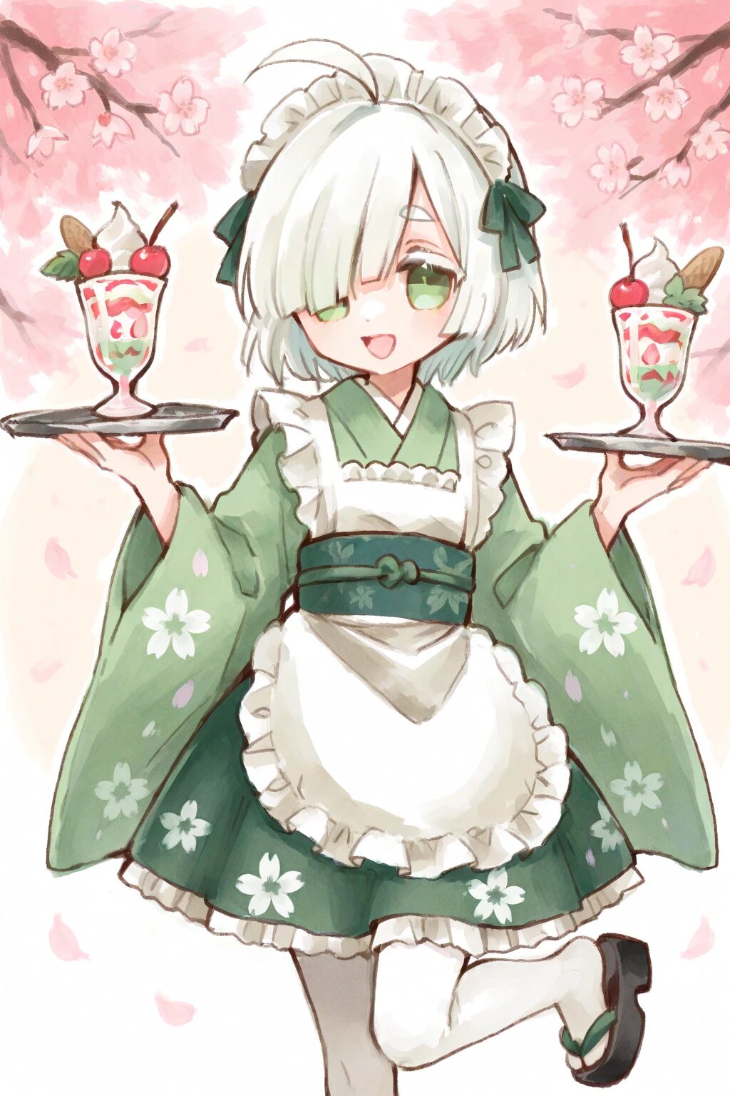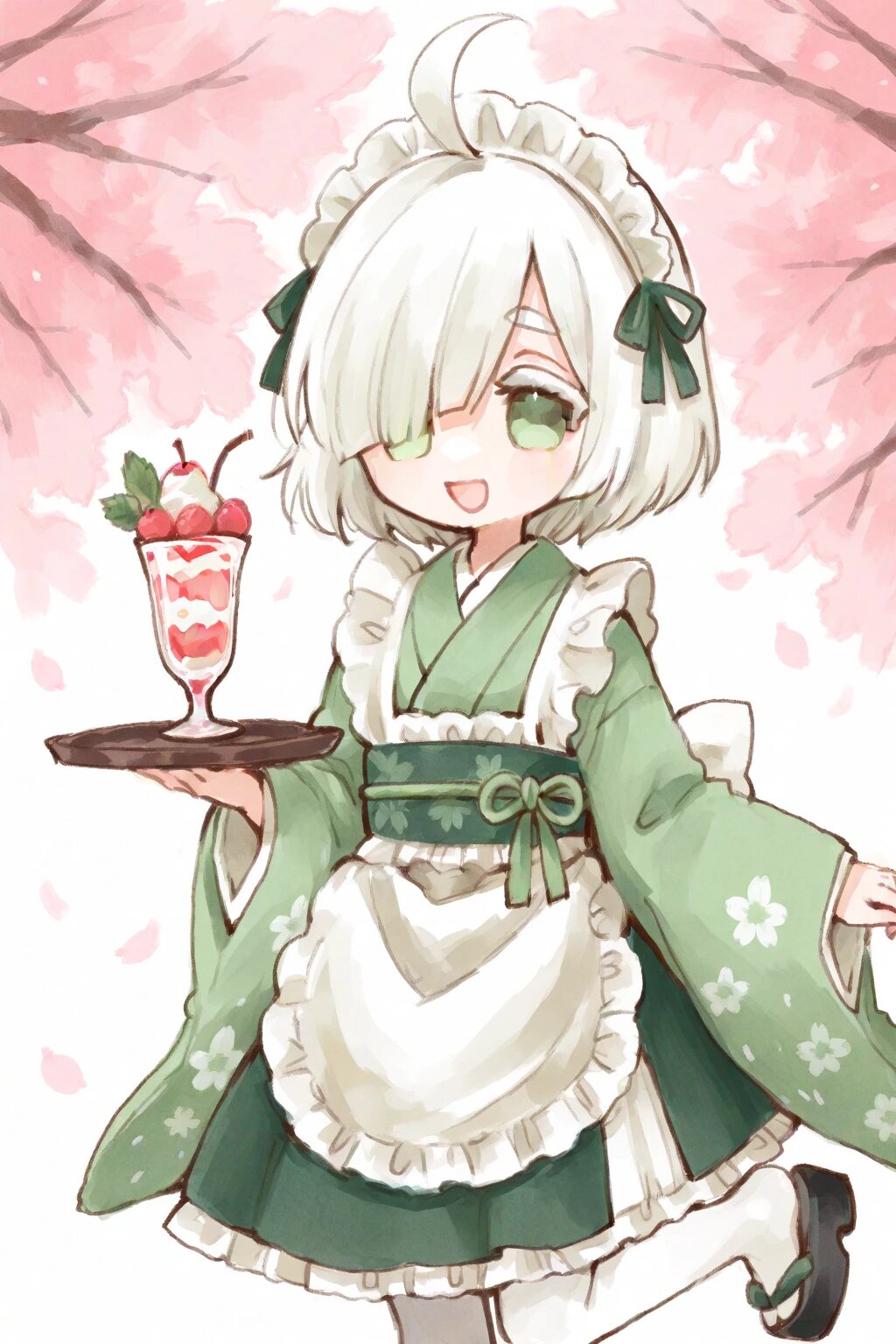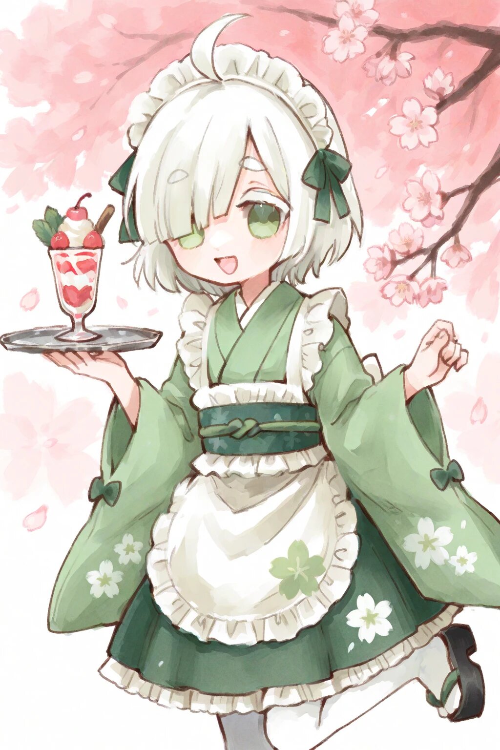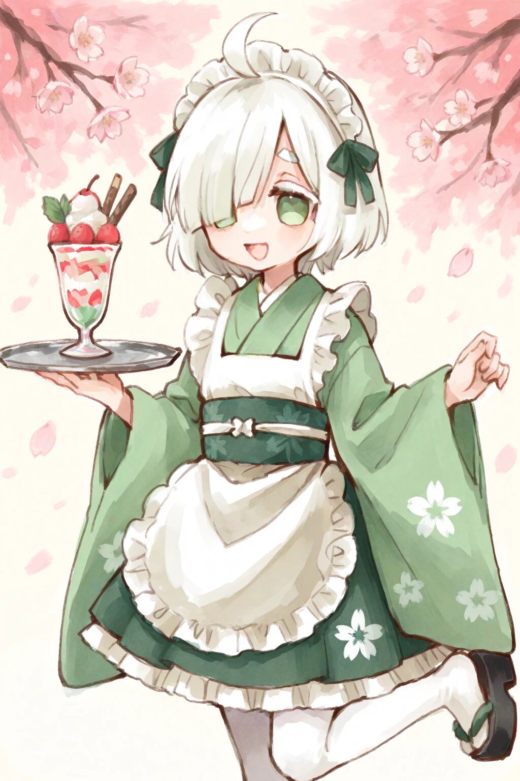 chibi, solo, 1girl, upper body, holding a tray with a strawberry parfait on it, cherry blossoms, (bright white hair), short hair, short low pigtailes, blunt bangs, white thick eyebrow, white colored eyelashes, (hair over one eye), ahoge, mint green eyes, frilly white apron, green kimono, flare skirt, maid headdress, white tights, black okobo, leg up, smile, open mouth, ultra-detailed, best quality, masterpiece, very aesthetic, watercolor painting, general