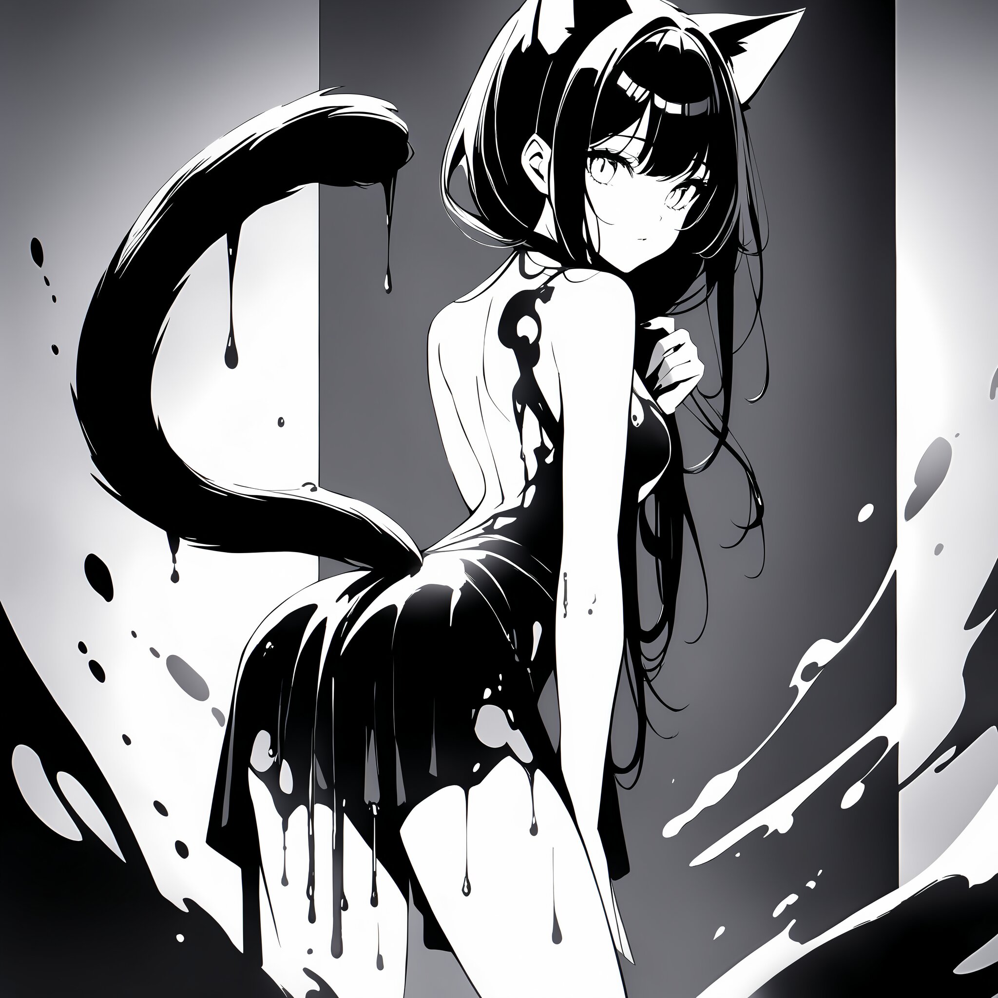 A mysterious and sexy cat-eared girl whose form is created from splashes of flowing black and gold ink. The ink wraps around her body like a tight, revealing silk dress, with drips falling from her fingertips and cat ears. Her tail is a long, dynamic brushstroke. Standing in an abstract white void, high contrast lighting, looking back over her shoulder with a sultry look, artistic body paint aesthetic, fluid motion, sharp focus, digital art masterpiece, 8k, intricate details.