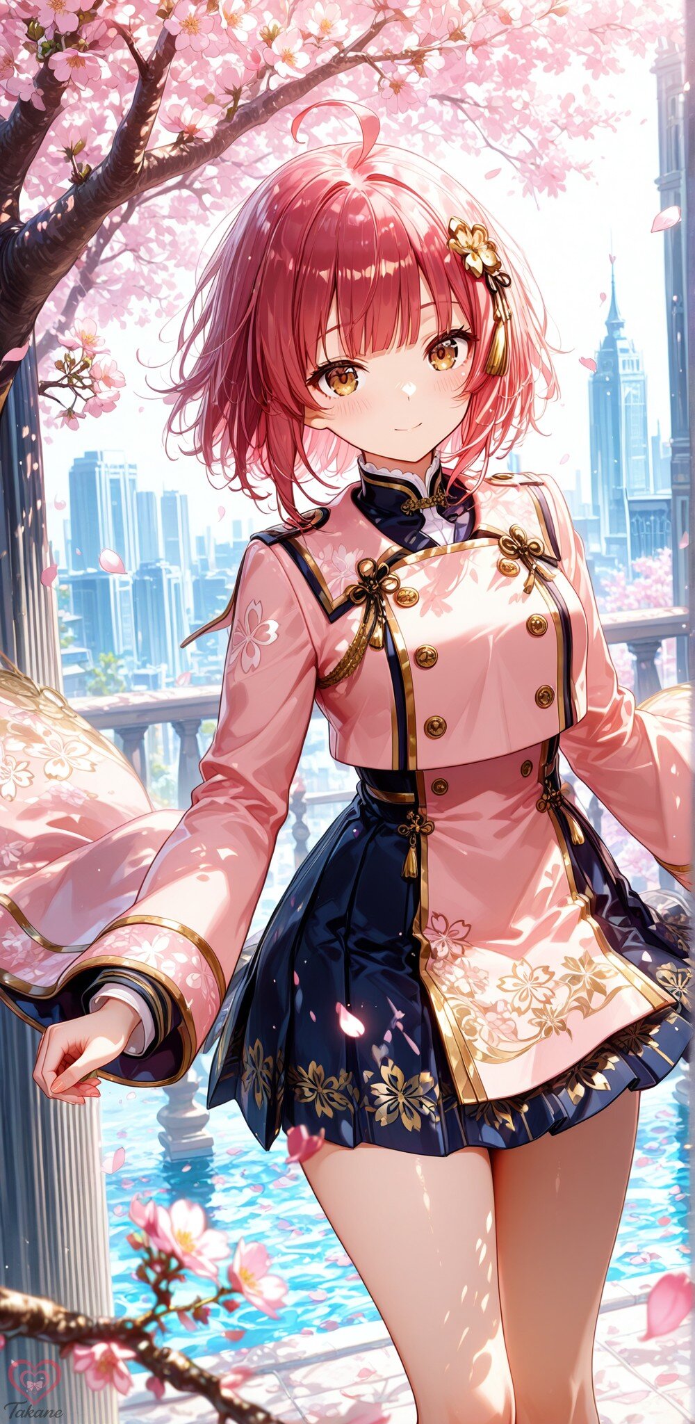 soft sakura pink wool-blend uniform fabric, subtle sheen, high-quality tailored material, dropped shoulders, wide long structured sleeves, loose fit, extended jacket length, standing collar with gold embroidered trim and sakura vine embroidery, hidden placket, gold sakura crest buttons, intricate gold piping, symmetrical dense sakura embroidery on chest with layered gradient petals and gold outlines, diagonal branch patterns across torso, heavy sakura branch embroidery from shoulder to cuffs with gold leaf accents, embroidered cuff borders, large-scale sakura tree embroidery on back with flowing branches and dimensional blossoms, subtle sakura jacquard base, gold metallic accents, ornate luxury uniform aesthetic,