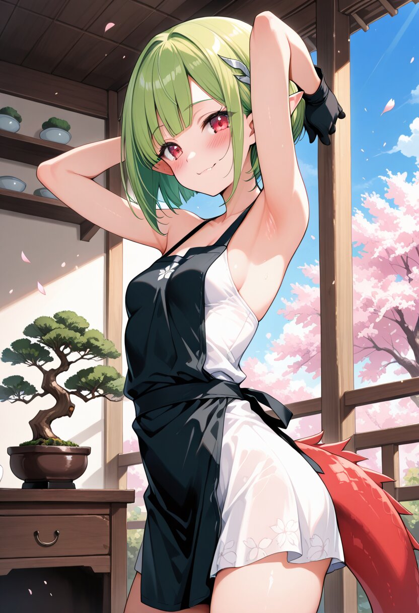 1elf girl, solo, short vibrant green bob haircut, crimson red eyes, pointed elf ears, small breasts, petite slender body, 150cm, blush, embarrased, short red tail, small fang, silver small dragon hair ornament, smooth skin, smile, blush,