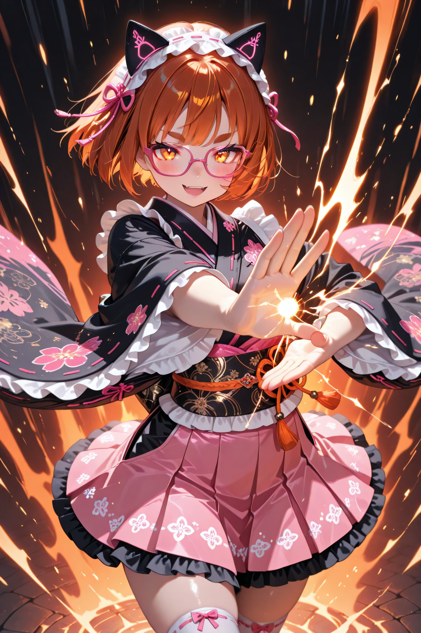 absurd, high definition, masterpiece, Highest Quality, great quality,ultra-detailed.cinematic angle,soft shadows,beautiful lighting. 1 girl, solo,"Chieko",standing,cowboy shot.dark orange hair,short bob hair,hair bang,cat ear headband and black color,white head dress,cute face,pink frame glasses,orange eyes,seductive smile,blush,healthy skin,thick eyebrows,open mouth;black frilled kimono,black nagoya obi,embroided details,pink mini skirt with white frill,white thigh-high socks,,skirt up wind,beautiful legs.,dynamic pose,fighting stance, hand focus, close-up hand,electric spark,focusing magical energy in her hands, glowing aura
