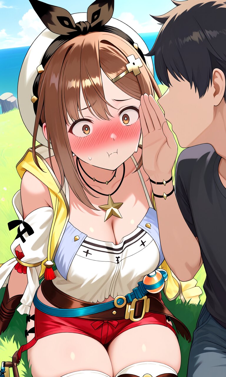 a giel starting to look a little bored while lying on the grass, pouting cutely, boyfriend turning to her and whispering a sex proposal, her eyes suddenly widening in shock, face instantly turning bright red, sitting up slightly with embarrassed panic, detailed flushed face and shy reaction, warm sunlight, cliff top with ocean view, erotic tension building, masterpiece, ultra detailed BREAK the boy(original boy, short hair, black eyes,) BREAK the girl(reisalin stout, large breasts, )