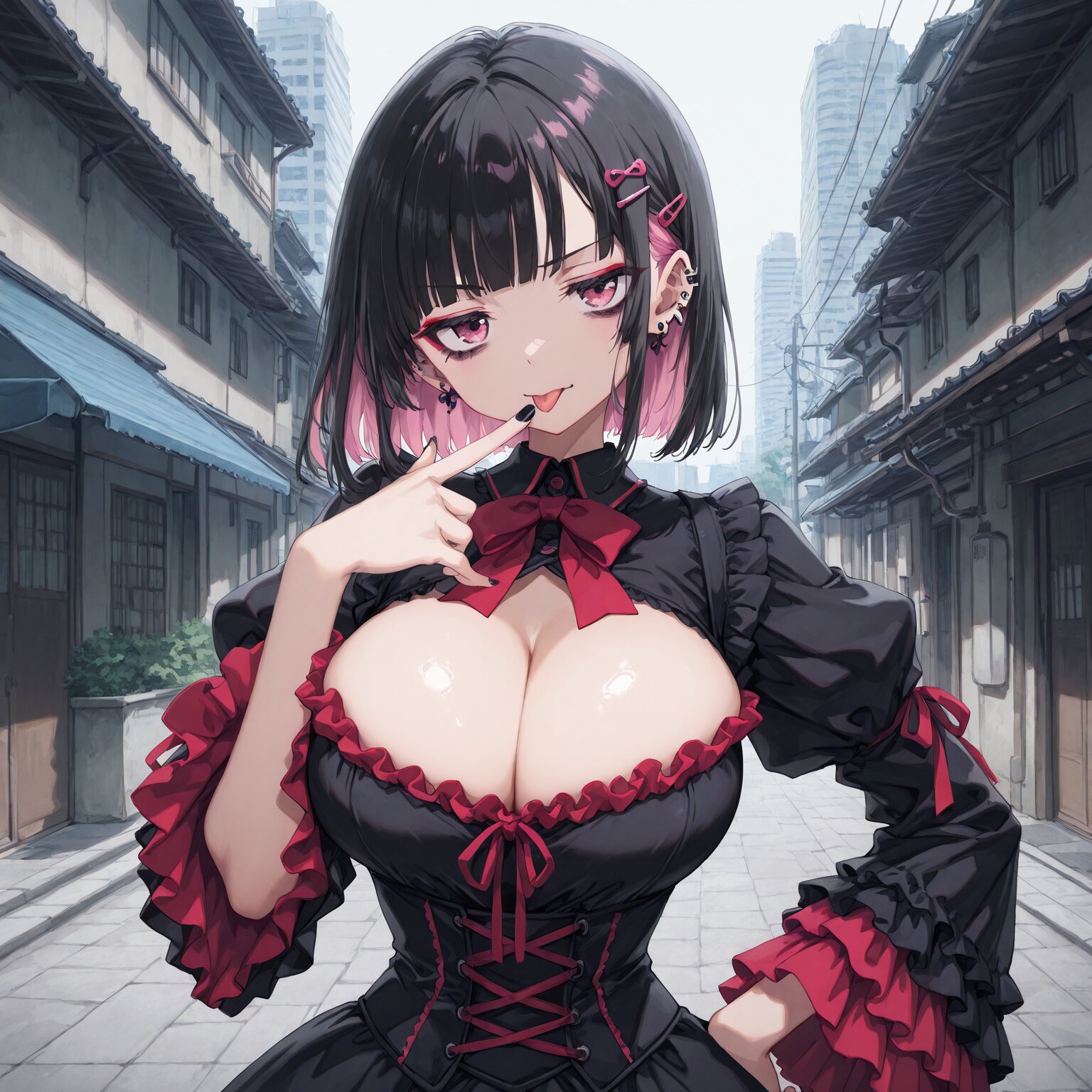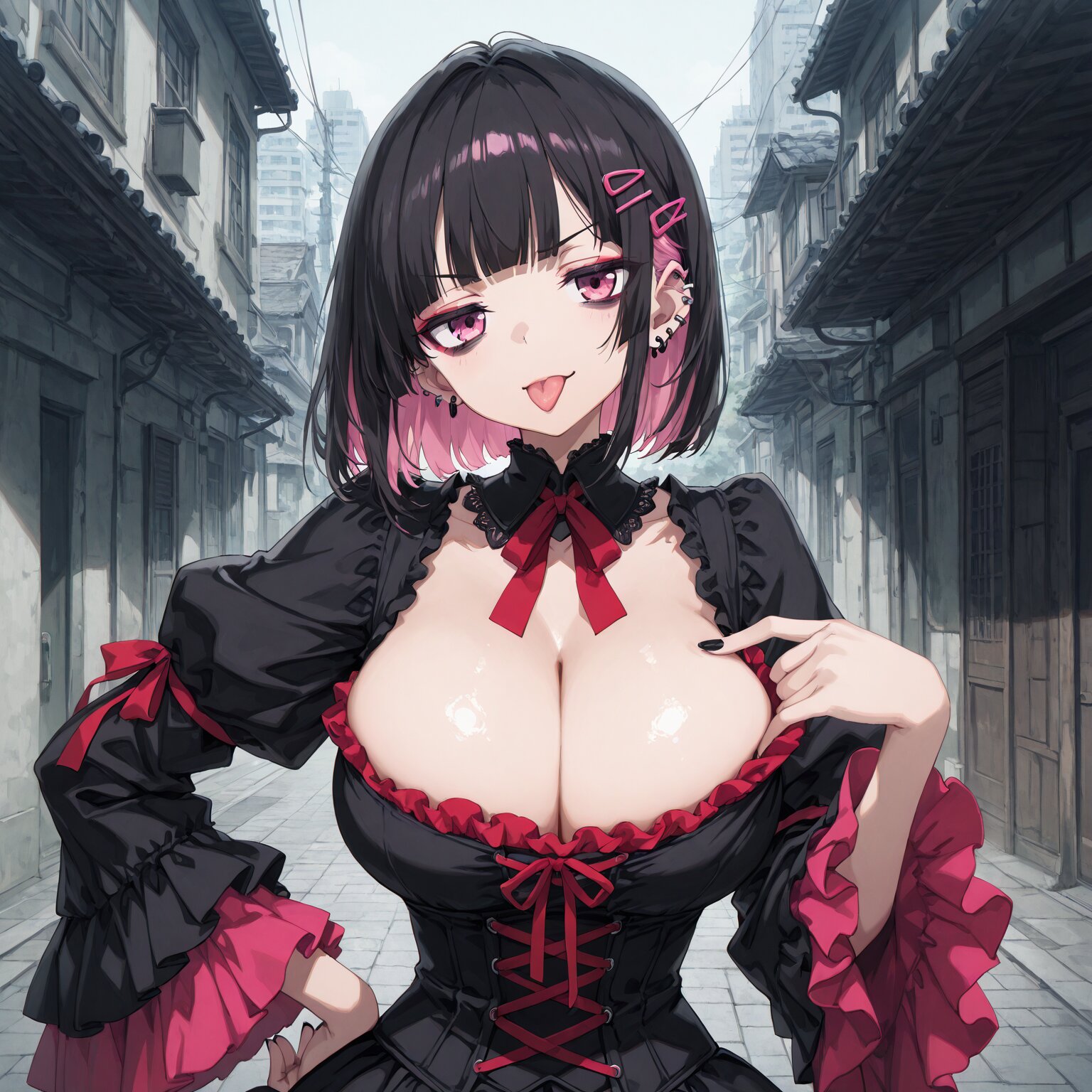 (1girl), young female, BREAK (makeup), deep makeup , eye moles under eyes, heavy eye shadow, ((gothic lolita, lolita fashion)) (Sharp eyes), (pink eyes), hime cut, blunt bangs, ((Bob hair:1.3)), ((black hair)), ((pink inner hair:1.2)), many piercings, (pink hair clip) BREAK, slim, small waist, hyper breasts BREAK, Slender, narrow waist, toned body, athletic body, shiny skin, beautiful pupils Black nails, gorgeous nails, nail decorations (jitome) Red ribbon, red frills pulling down lower eyelid with finger tip, sticking out tongue, one hand on her hip, >:p Showing her cleavage, putting a finger in her cleavage ((Night, darkness)) City, urban streetscape BREAK, (newest, anime, animation, anime screen capture, anime style:1.3) BREAK, (masterpiece, , vibrant, very aesthetic, highly detailed, best quality, 16k:1.3)
