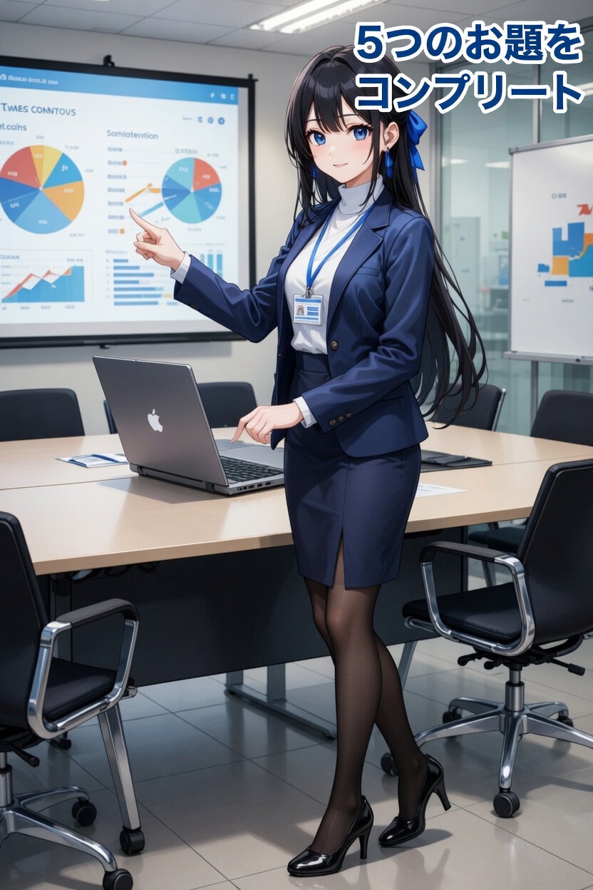 日本人女性24歳のデジタルイラスト。「5つのお題をコンプリート」というテキストを合成する。