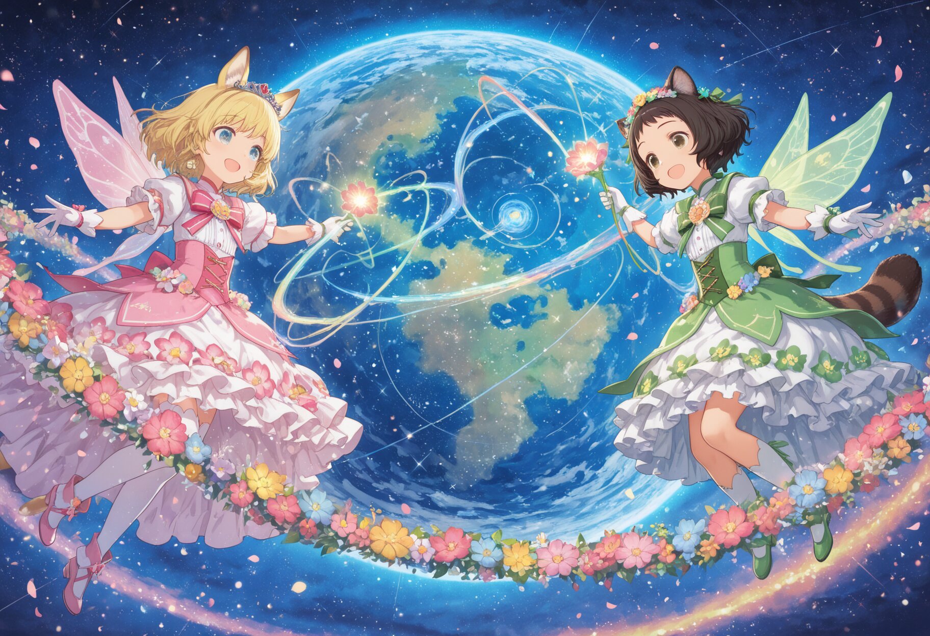 2girls, mid, general, traditional media, picturebook-style, (colored colored pencil \(medium\)), pastel colors, soft tone, no lineart, no outline, (drawing lines, Paper texture), ultra-detailed background, Very detailed costumes, (barasui:0.1), (oyari ashito:0.1), (masterpiece, best quality, amazing quality, very aesthetic, high resolution, ultra-detailed, absurdres,), fantasy space background, deep starry sky, colorful nebula, glowing particles, cosmic light, magical atmosphere, magical girls floating in space, casting magic together, creating a huge flower wreath around the earth \(planet\), giant flower crown surrounding the milky way, colorful flowers, petals, sparkles, magical energy ribbons, whimsical fairy tale atmosphere, dreamy, bright colors, joyful mood, sparkles, glowing magic circles, flower petals flying, cosmic fairy dust, magical aura BREAK loli, light brown hair, medium hair, choppy bangs, blue eyes, (light brown fox ears, Light brown fox tail with white tip, petite), BREAK loli, dark brown hair, short hair, messy hair, short bangs, green eyes, tareme, (dark brown raccoon ears, dark brown raccoon tail with striped pattern),