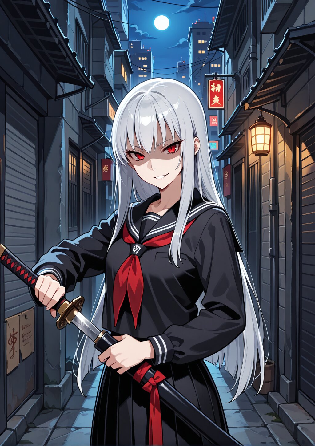 <lora:hirugao_V0.1:1>, Hirugao, silver hair, long hair, straight hair, red eyes, light skin, tsurime, black serafuku, long sleeves, pleated skirt, solo, looking at viewer, upper body, standing, katana, sheath, holding sword, holding sheath, unsheathing, drawing sword, night, city alley, darkness alley, shaded face, bright eyes, moonlight,