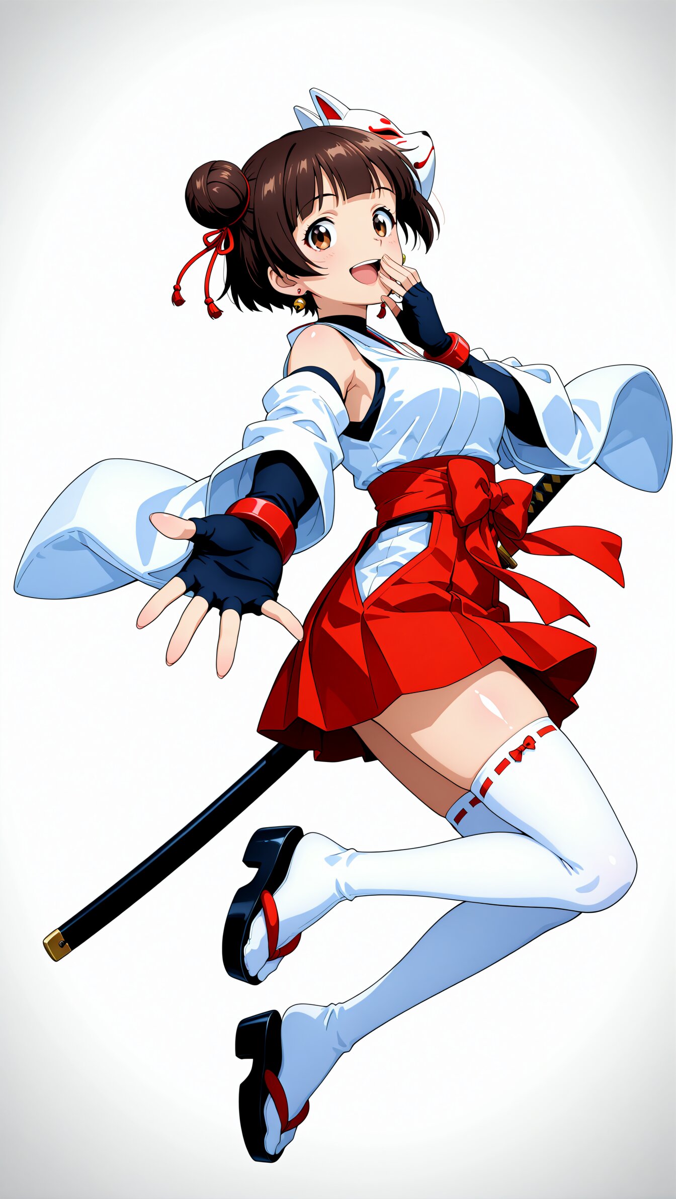 <lora:MeMax6-noob-vpred:1>,memaxl6_a,memaxl6_b,memaxl6_c,memaxl6_d,memaxl6_e, (10's anime style), Full HD,32K, 1girl, solo, full body, from side:1.4, jumping:1.4, dynamic pose, shiny skin, smile, happy, laughing, open mouth, looking at viewer, reaching towards viewer, hand on own chest, arched back, 4K, 1girl, (teenage), (portrait:2.0, from front1.6),surprised, wide-eyed, (looking at viewer), (hands over mouth), face focus, solo, medium breasts, shiny skin, (skinny), one sword on back, katana, Strap, mask on head, traditional Japanese mask, mysterious, fox mask, red bowtie, (japanese clothes, red-white miko:1.6), bare shoulders, black undershirt, japanese-style earrings, (very short hair:1.2), double bun, ((dark brown hair)), (brown eyes), (tareme), (((sideburn))), (blunt bangs), short gloves, black fingerless gloves, (white background, ), anime, anime screencap, masterpiece, best quality, very aesthetic, newest, hyper detailed, beautiful, aesthetic, yume kawaii,