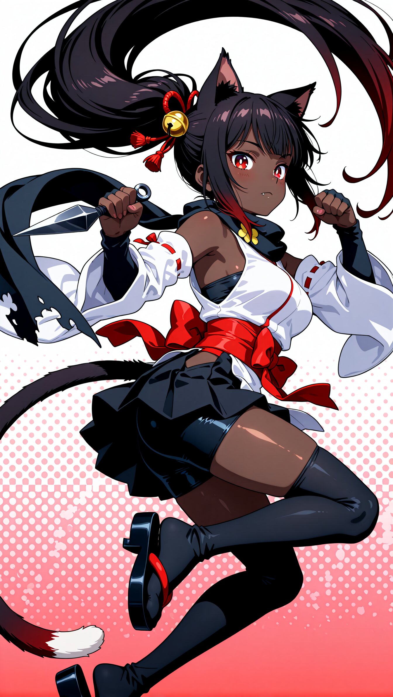 <lora:MeMax6-noob-vpred:1>,memaxl6_a,memaxl6_b,memaxl6_c,memaxl6_d,memaxl6_e, 10's anime style, Full HD, 32K, 1girl, full body, (from side), jumping:1.2, dynamic pose, leg up, (solo), (teenage):1.4, medium breasts, (very dark skin:1.4), (hair ornament, hair bell, heir ribbon), red-white miko:1.2, (black hakama short skirt:1.8, bike shorts, ), (bare shoulders, ), japanese clothes, clothing cutout, black thighhighs, (black undershirt, long sleeves), (red bowtie), (kunoichi), geta, black scarf, red bowtie, black tabi, tsurime, medium breast, beautiful hair, shiny hair, (black hair, very long hair, ponytail), (red eyes:2.0), sidelocks, choppy bangs, cat ears, cat tail, shaped pupils, (white pupils:1.2), fangs, shiny skin, faint lips, blush, looking at viewer, expressionless, closed mouth, holding weapon, kunai, (gradient background, white background, red background, polka dot background:1.2), masterpiece, best quality, super fine illustration, very aesthetic, newest, hyper detailed, intricate, beautiful, aesthetic, highly decorative, HDR, yume kawaii, ,anime screencap, anime, no gradients, 2D flat design, bold outlines,