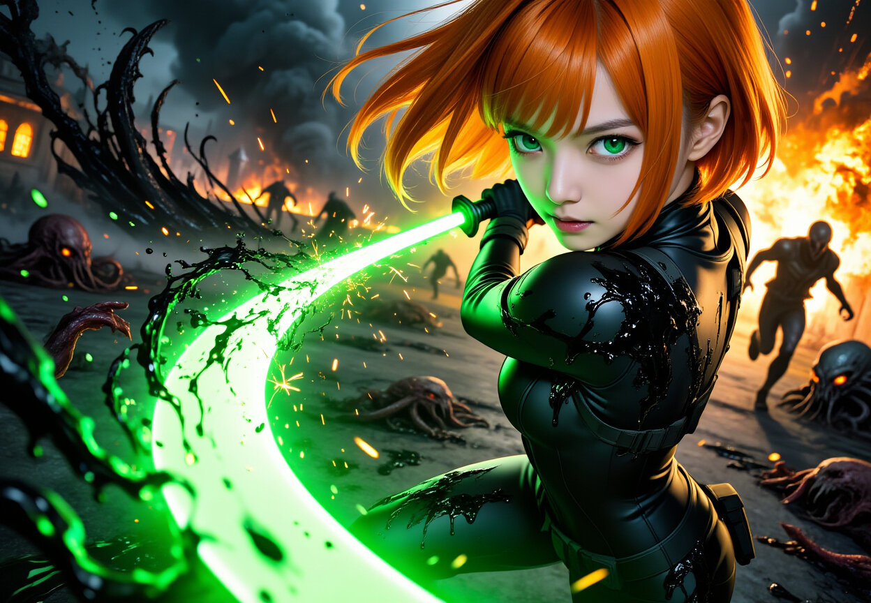 実はコズミック・ホラー的な怪異が好きなのです。AIイラストを触り始めたのも、クリーチャーを切り裂くかっこいいヒロインのイメージを形にしたかったから。原点的なモチーフをこの1枚に込めました。