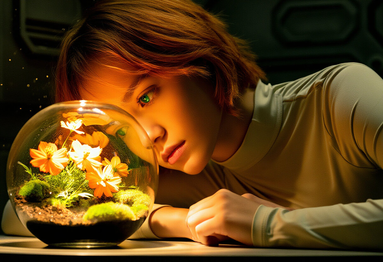 彼女は決して社交的ではありませんが、この小さなガラス球の中で咲くコスモスには柔らかな表情を見せます。暗い部屋でテラリウムの光を見つめる彼女の横顔に、少しでも「救い」を感じてもらえたら嬉しいです。