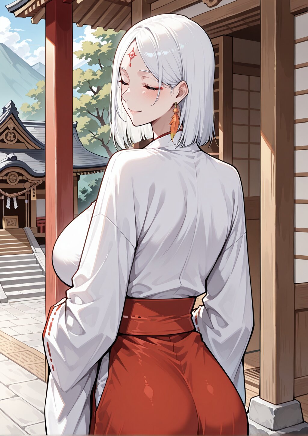 solo, <lora:Tsubaki_V0.1:1>, Tsubaki_OC, medium hair, straight hair, parted bangs, white hair, red forehead mark, closed eyes, single earring, orange feather earring, miko, shrine, standing, heads together, looking back, from behind, smile, cowboy shot,
