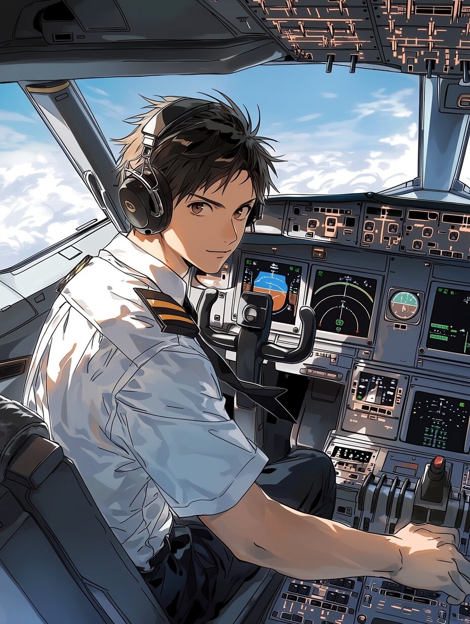Airplane captain, too beautiful young man, short black hair, holding the controls, headphones for captain, inside the cockpit