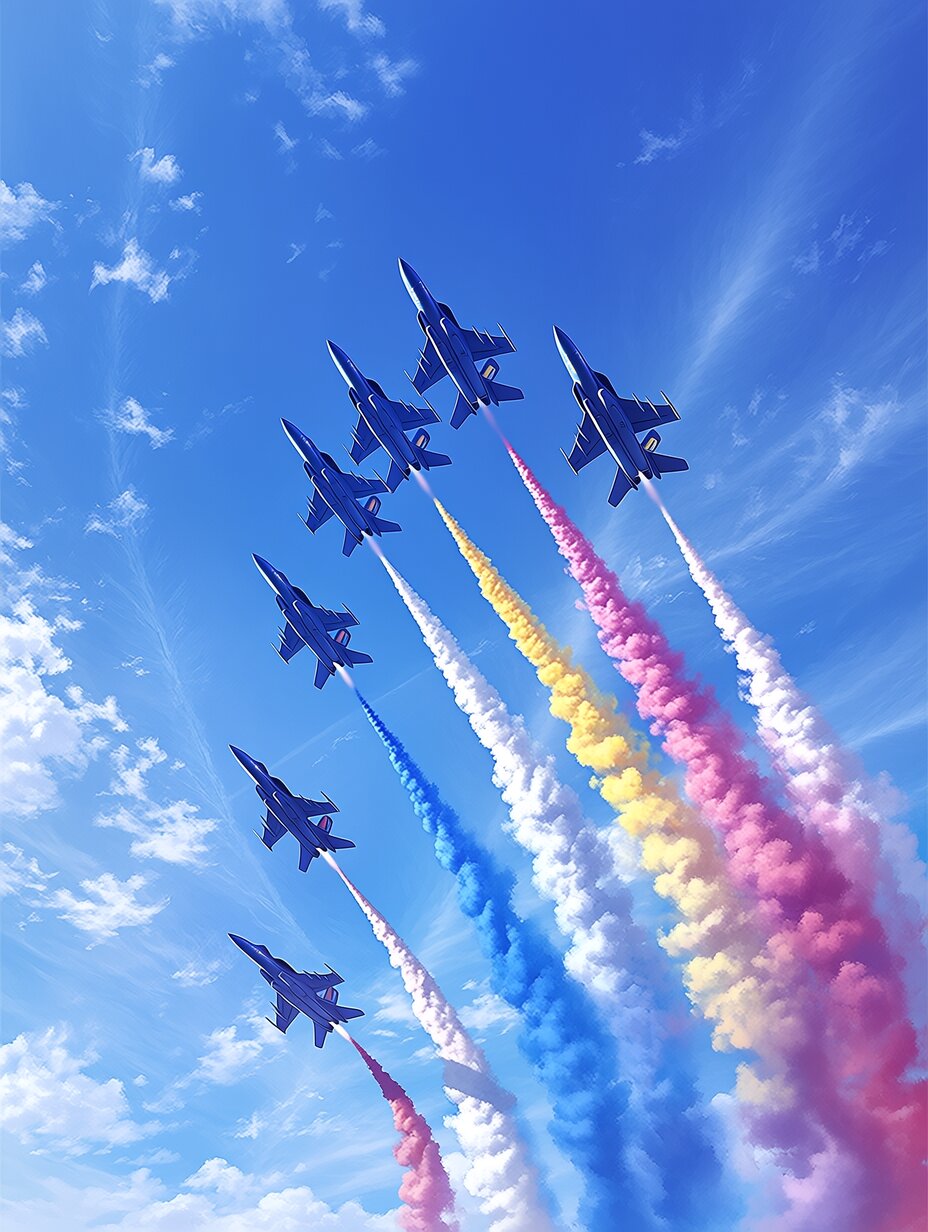 A formation of six dark blue fighter jets in mid-flight, performing an aerial maneuver. Each jet is leaving a distinct, colored smoke trail: blue, yellow, pink, white, and red. The jets are sleek and modern in design. A clear, bright blue sky filled with scattered, wispy white clouds. The scene is high in the atmosphere during daytime. Realistic digital photography, vibrant colors, capturing a moment of precision and spectacle. Bright, natural daylight illuminating the scene from above and slightly to the side, casting subtle shadows on the undersides of the jets. The smoke trails are illuminated by the ambient light. A dynamic, slightly upward-looking shot, framing the jets and their colorful trails as they ascend diagonally across the frame. The composition emphasizes the vastness of the sky and the coordinated movement of the aircraft.