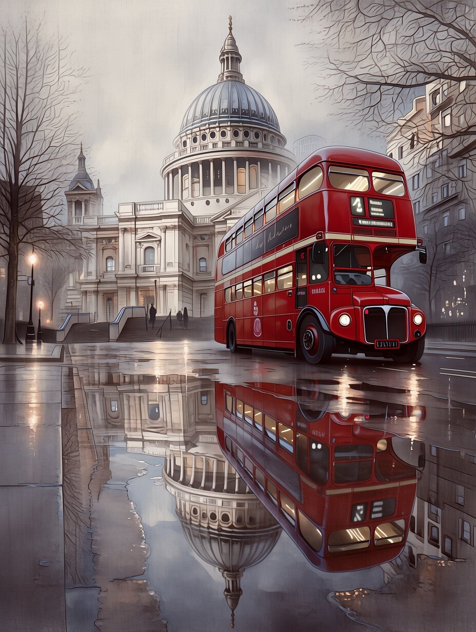 A classic red double-decker London bus, with its front facing towards the viewer and slightly angled to the right, displaying the route number 26 and 'Hackney Wick' destination on its front signage. The bus has illuminated interior lights visible through its windows. An urban street scene in London, with the iconic St. Paul's Cathedral as the prominent background. The street is wet and reflective, with large puddles on the ground capturing the architecture and the bus. Bare trees suggest a cooler season. A few pedestrians are visible on the steps of the cathedral. Realistic analog photography with a slightly desaturated, moody color palette, emphasizing the urban and architectural grandeur. High detail with a cinematic feel. Overcast, diffused daylight, creating soft shadows. The reflection in the puddles subtly captures the ambient light. The bus's headlights and interior lights provide localized illumination. A low-angle shot, looking up from ground level and capturing the reflection of St. Paul's Cathedral and the bus in a puddle. The bus is positioned in the mid-ground, and the cathedral dominates the background. The composition utilizes leading lines formed by the street and reflections, with a shallow depth of field creating bokeh in the foreground and background elements.