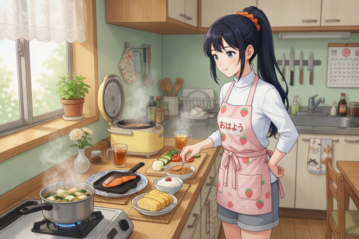 日本人女性24歳のデジタルイラスト。自宅のキッチンで朝食作り。和食の朝食を1人分作っている。カジュアルな服装をして、エプロンをつけている。