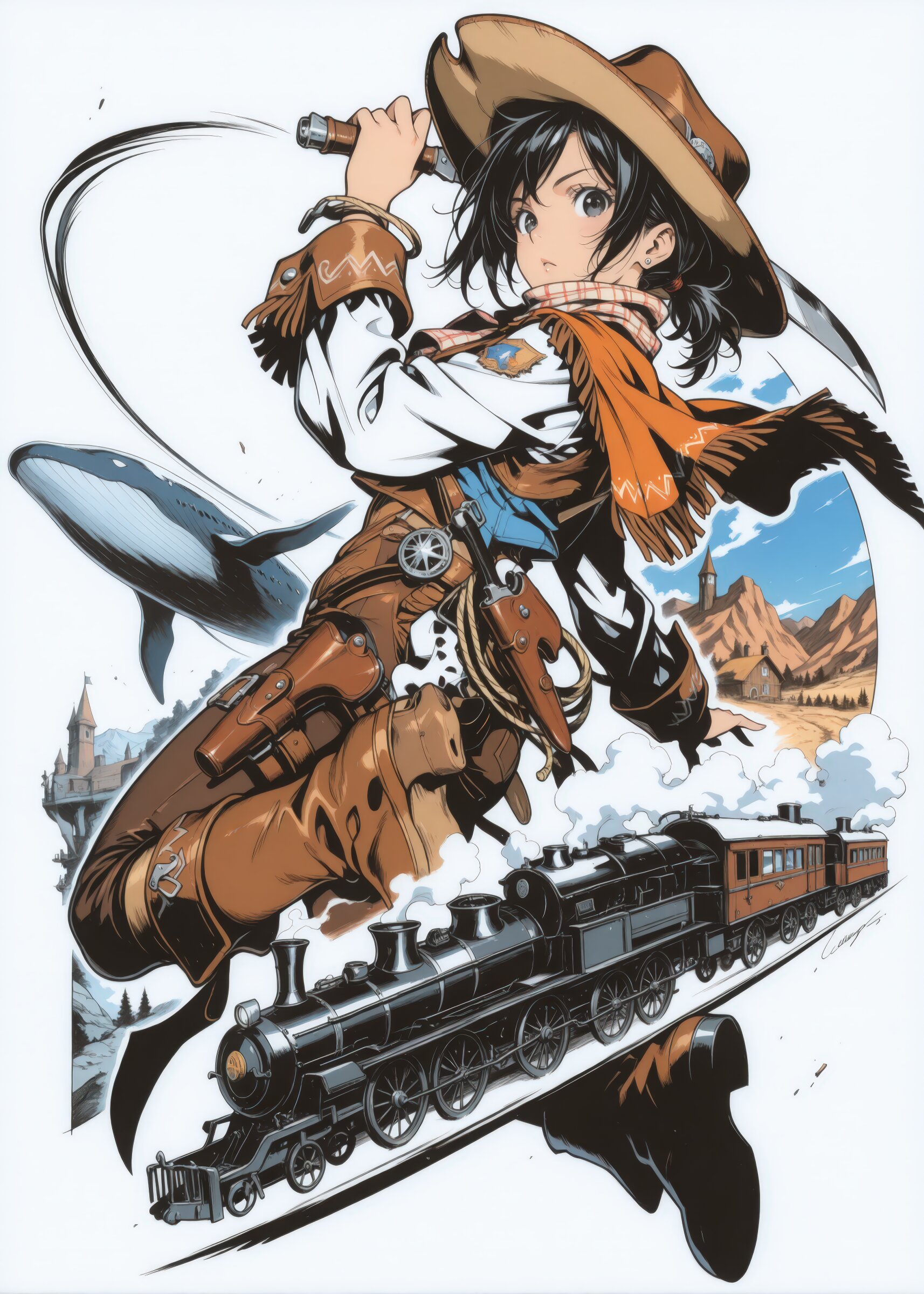 masterpiece, best quality, traditional media, color sketch style, rough lines, hatching \(texture\), lineart emphasis, halftone, comic-style, colored pencil \(medium\), flat color, solo, 1girl, cute face and eyes, black hair, clear black eyes, single short ponytail hair, cute and lovely, Vigorous, lively, and spontaneous personality, western comics \(style\), holding knife, Steam locomotive, flying whale, Wild West Cowgirl, a cowboy hat, a vest, boots, and a holster, a lasso, and spurs Stud earrings, dynamic pose, cinematic angle, official art, official wallpaper,