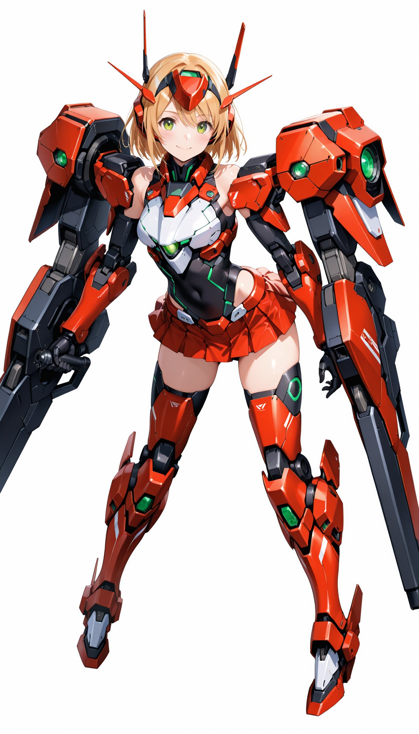 1girl, ((white background)), ultra detailed 8k cg render, masterpiece, high resolution, extremely detailed, mecha musume,mecha shoulder, mech leg, headgear, mecha armor, ((mini skirt)),long blonde hair, dropping green eyes, smile, dynamic posing,
