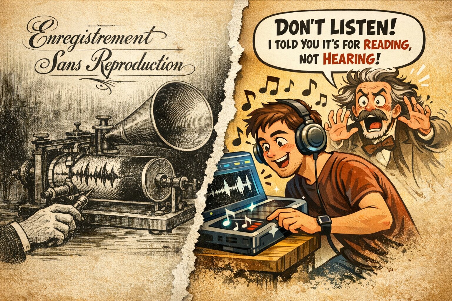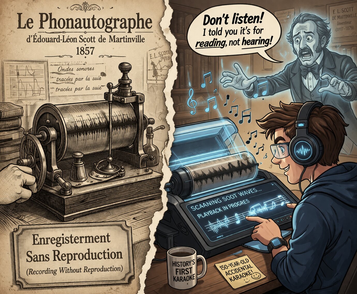 A creative split-screen illustration divided by a torn-paper effect. Left side: A 19th-century vintage engraving style showing Edouard-Léon Scott de Martinville's "Phonautograph." A hand is cranking the machine, and a needle is etching sound waves onto a soot-covered paper cylinder. The atmosphere is academic and historical, with elegant French typography reading "Enregistrement Sans Reproduction" (Recording Without Reproduction). Right side: A modern, humorous cartoon style. A young man from the 21st century wearing high-tech headphones is using a futuristic digital scanner to play back the soot-covered waves as music notes. Behind him, the panicked ghost of the inventor is shouting, "Don't listen! I told you it's for reading, not hearing!" in a speech bubble. Overall: The background is an aged parchment texture. The contrast between the serious black-and-white etching and the colorful, witty modern comic style highlights the irony of the "150-year-old accidental karaoke." High quality, detailed, storytelling composition.