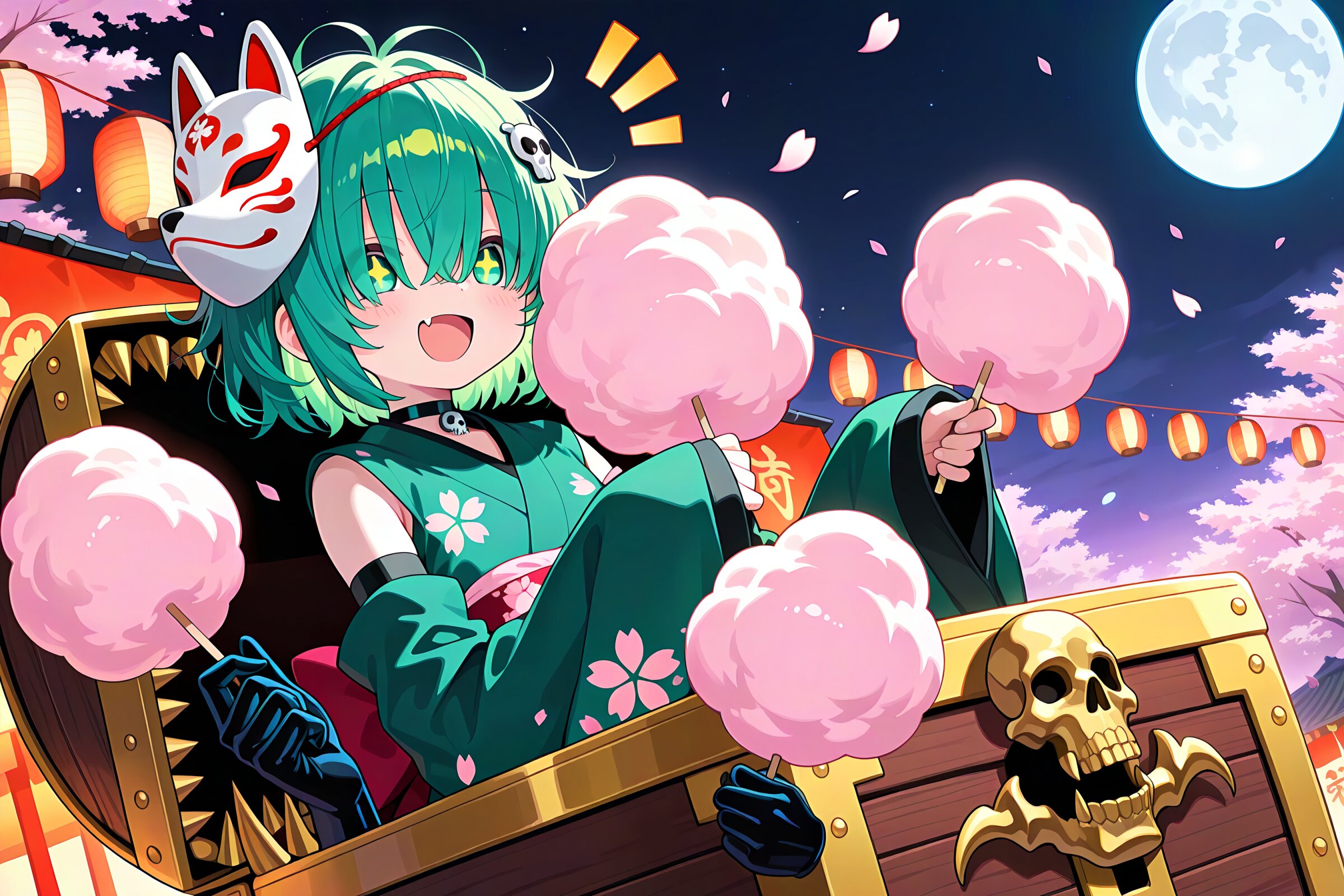1 little girl, solo, diagonal angle, masterpiece, best quality, amazing quality, very aesthetic, cobalt green hair, short hair, messy hair, (hair over eyes:1.2), green eyes, demon fangs, +_+, open mouth, smile, cheerful, +++, notice lines, choker, green kimono, sleeves past wrists, sleeves past fingers, (oversized sleeves:1.2), detached sleeves, skull hair ornament,sakura print, (floating black ghosty hands:1.2), fox mask, in mimic chest, holding cotton candy, night, cherry blossom, many sakura petal, japanese festival, moon,
