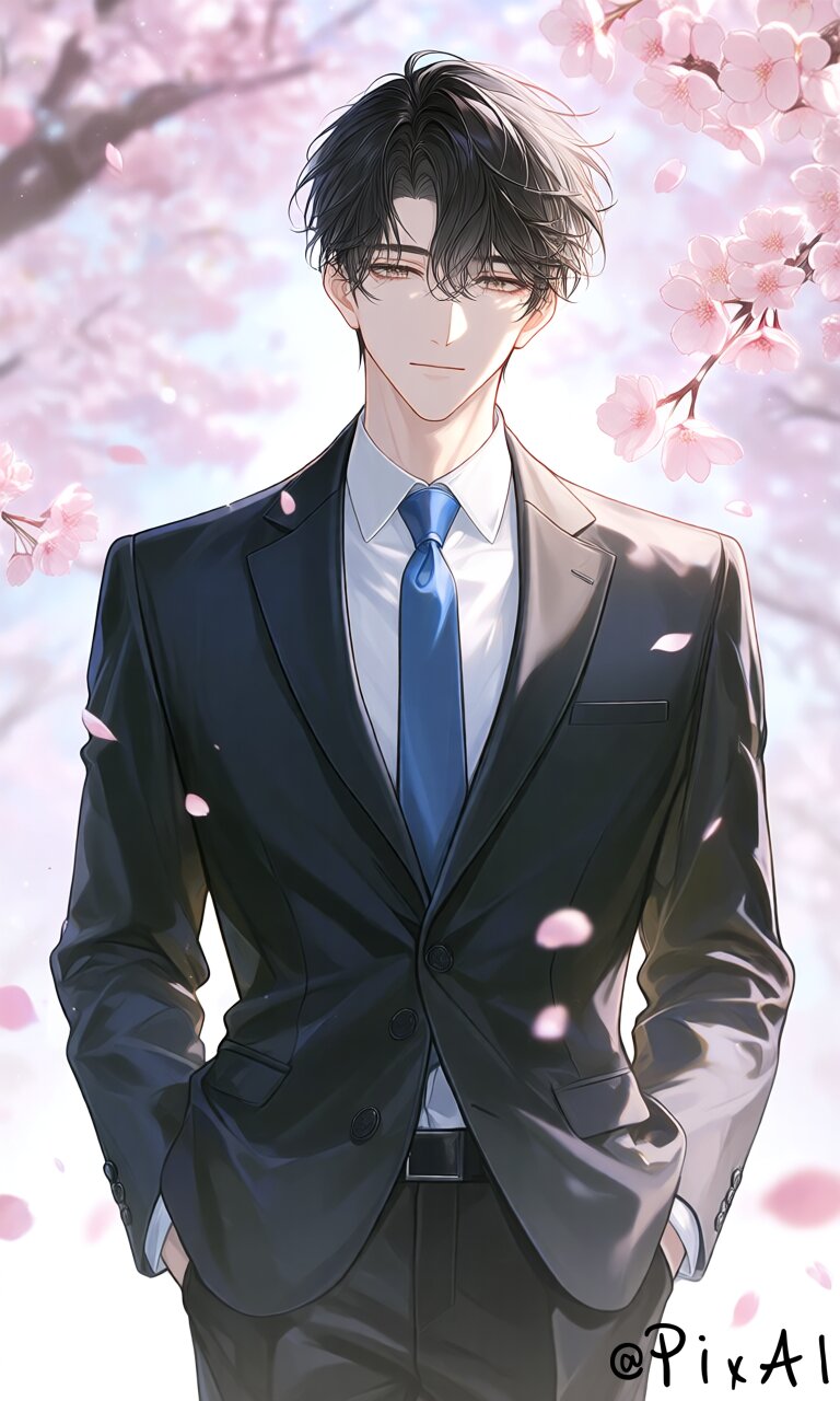 back ground cherry blossom, full body, A breathtakingly handsome young Japanese man, His black hair was a little disheveled, and a few streaks hung over his forehead, The pale brown eyes have a quiet, melancholy glow, long eyelashes, sophisticated features, elegant jawline, and dark suit. White shirt, silk blue tie, thin slacks. a calm and serious atmosphere. It features animation illustrations, high-definition, ultra-detailed, sophisticated shading, perfect symmetry, cinematic soft light, elegant aesthetics, and sophisticated beauty. The lights are soft and warm, with a gentle glow on the face and hair, creating a dreamy and ether-like atmosphere. The overall mood is innocent, bright, somewhat melancholic, expressed in a soft, pictorial animated art style focused on delicate line work and lights, full body, character reference
