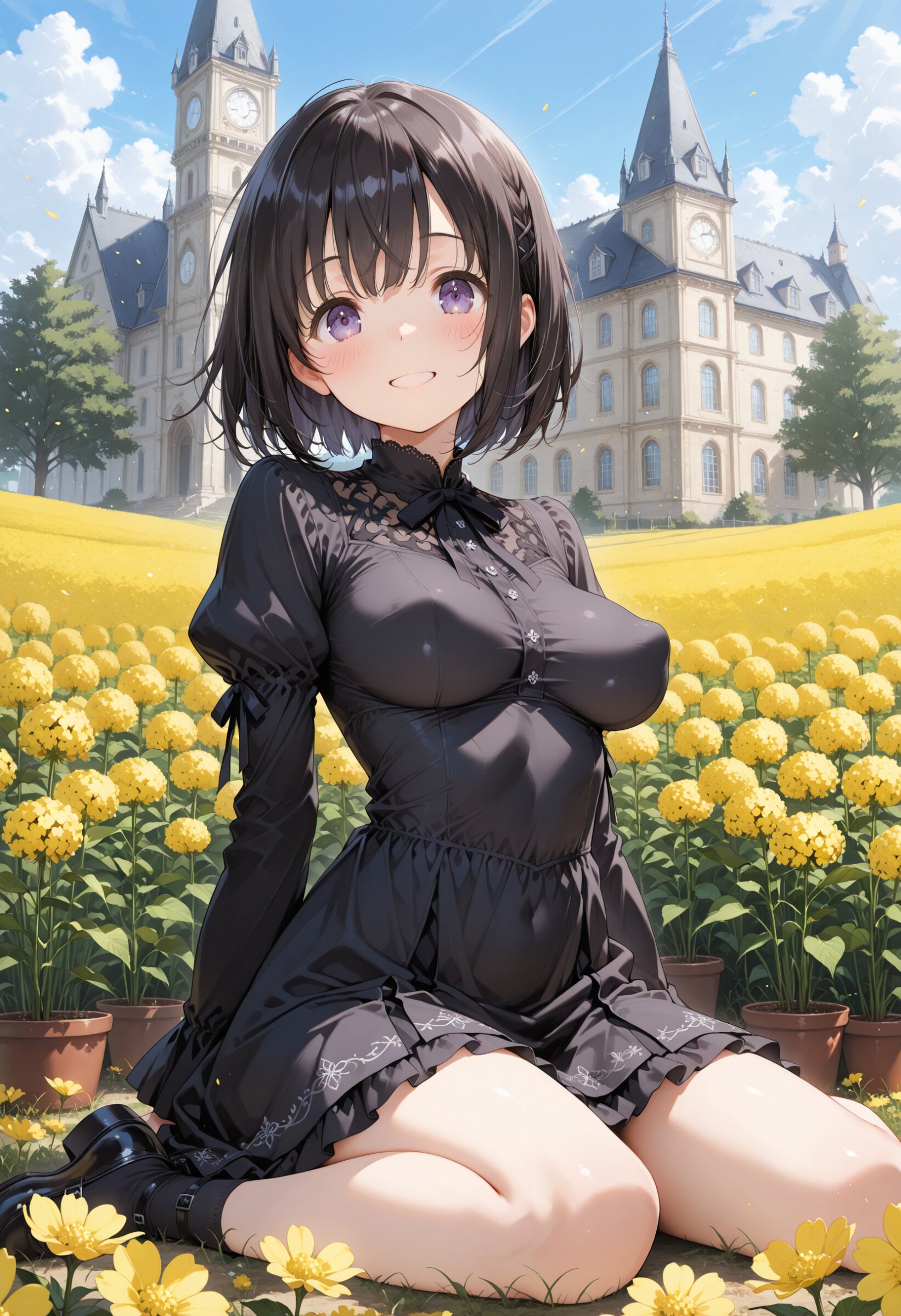 masterpiece, best quality, highres, ultra-detailed, extremely detailed, detailed, 1girl,loli , (petite:1.2), beautiful hair,, black gothic dress, big breasts, impossible clothes, (perky breasts:1.2), Gothic architecture, happy, sitting, wariza,, country side, A wide rapeseed flower field , smile,garden, innocent expression, cowboy shot, happy, look at viewer, from below,