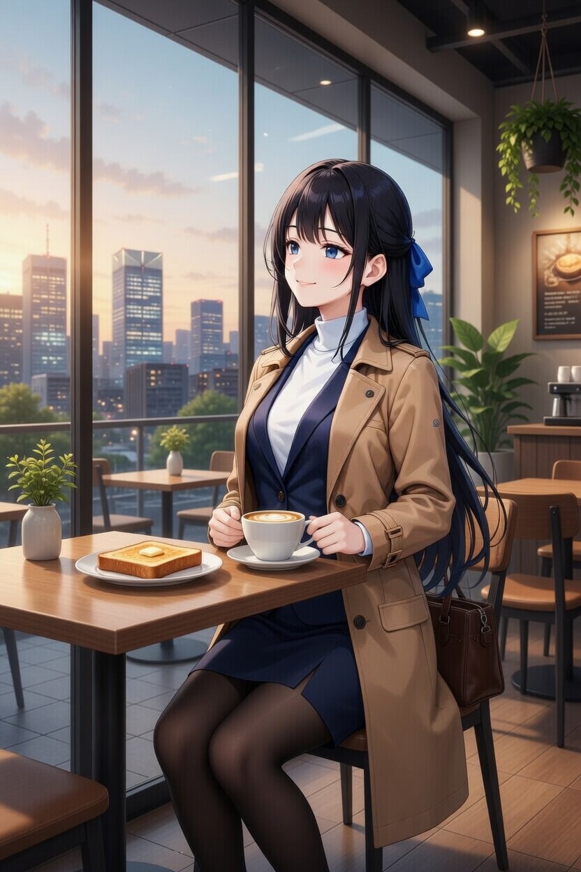 トーストとコーヒーの朝食をとっている日本人女性24歳のイラスト。都心にあるカフェ。