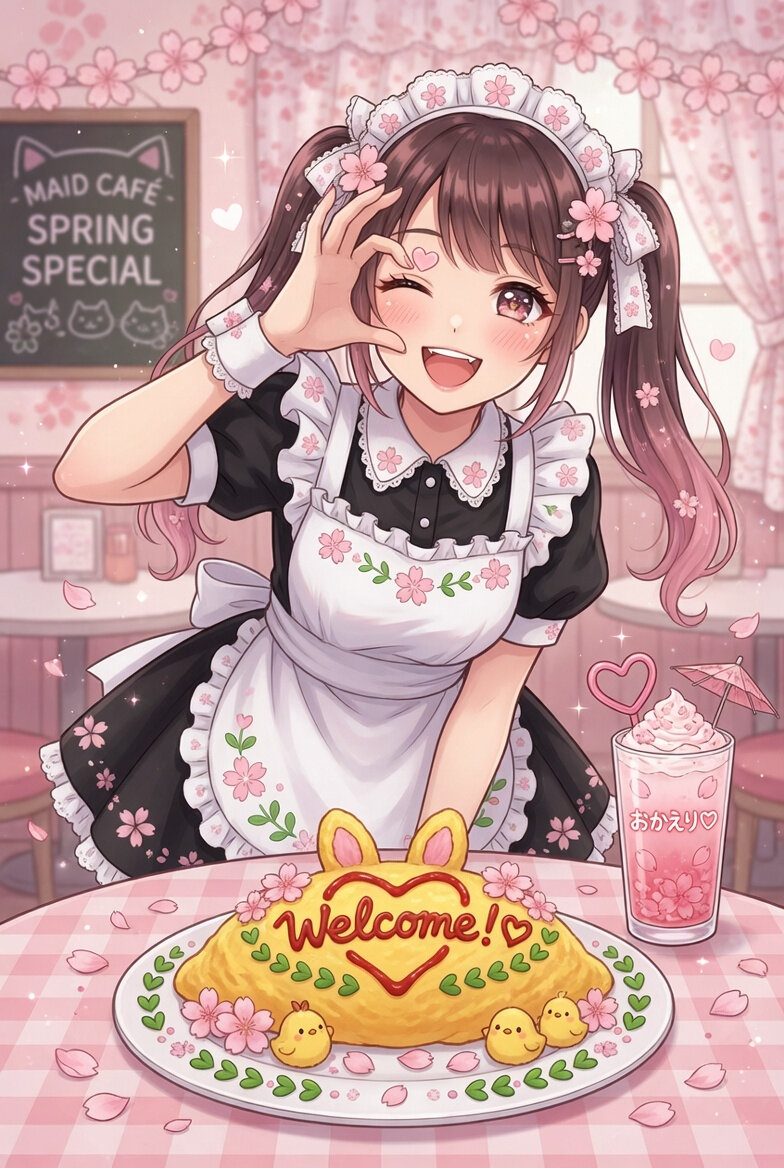 メイド喫茶のメイドである女性のデジタルイラスト。春をモチーフに装飾したオムライスと、桜色のドリンクを前に、ハートハンドのポーズ。歓迎の笑顔。
