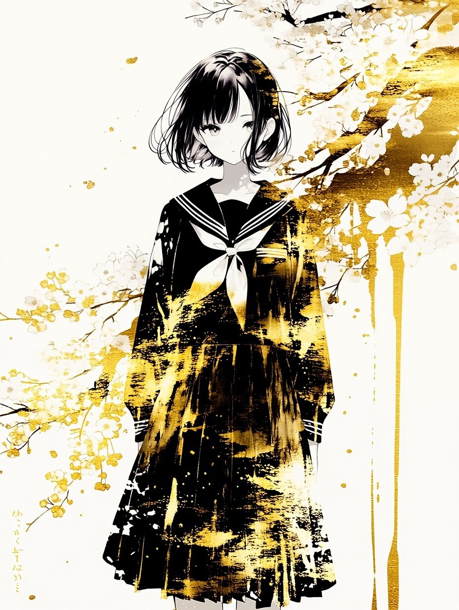 Vector art in ink gold wash style painted , Sailor uniform, golden glowing effects, and a simple golden Cherry Blossoms background.spring Graduation style,