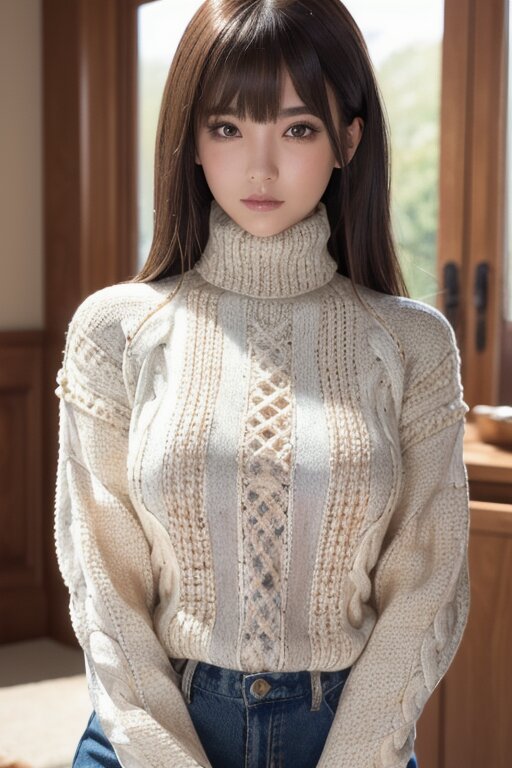 masterpiece, hyper detailed, 8K, hyper detailed illustration, Japanese woman, 23yo, cute, pretty, hyper detailed face, hyper detailed eye, beautiful eye, medium hair,bangs, thin, tall,170cm tall, ((turtleneck long sweater,Hand-knitted Sweater:1.2)),cleavage cutout, sleeve long sweater,thigh, hyper detailed,