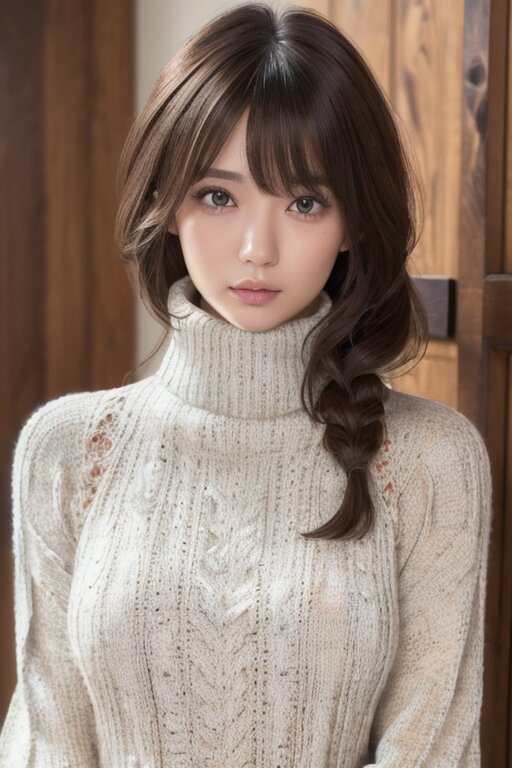 masterpiece, hyper detailed, 8K, hyper detailed illustration, Japanese woman, 23yo, cute, pretty, hyper detailed face, hyper detailed eye, beautiful eye, medium hair,bangs, thin, tall,170cm tall, ((turtleneck long sweater,Hand-knitted Sweater:1.2)),cleavage cutout, sleeve long sweater,thigh, hyper detailed,