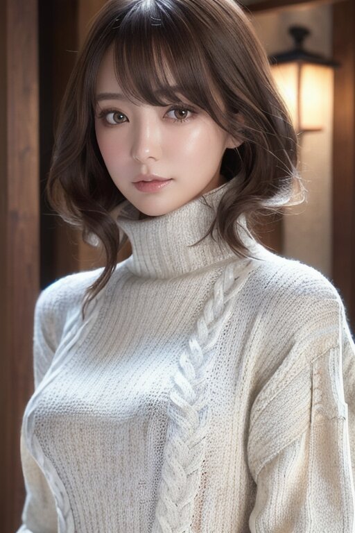 masterpiece, hyper detailed, 8K, hyper detailed illustration, Japanese woman, 23yo, cute, pretty, hyper detailed face, hyper detailed eye, beautiful eye, medium hair,bangs, thin, tall,170cm tall, ((turtleneck long sweater,Hand-knitted Sweater:1.2)),cleavage cutout, sleeve long sweater,thigh, hyper detailed,