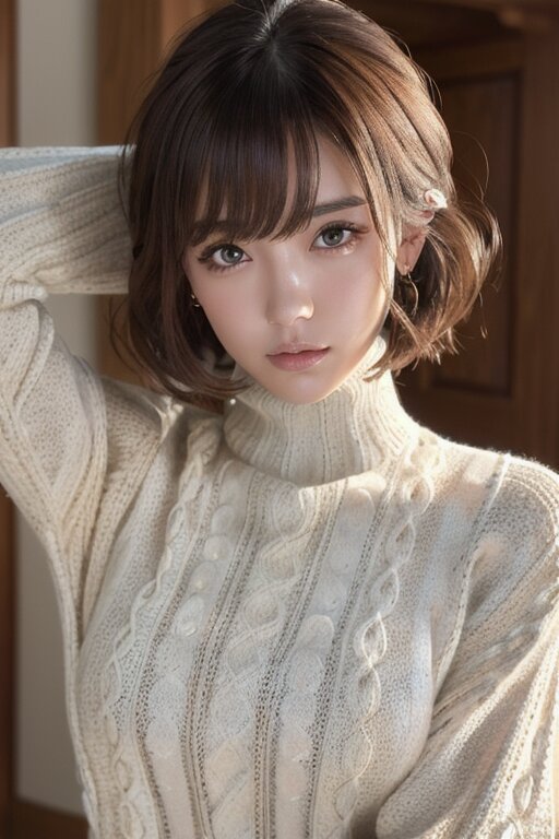 masterpiece, hyper detailed, 8K, hyper detailed illustration, Japanese woman, 23yo, cute, pretty, hyper detailed face, hyper detailed eye, beautiful eye, medium hair,bangs, thin, tall,170cm tall, ((turtleneck long sweater,Hand-knitted Sweater:1.2)),cleavage cutout, sleeve long sweater,thigh, hyper detailed,