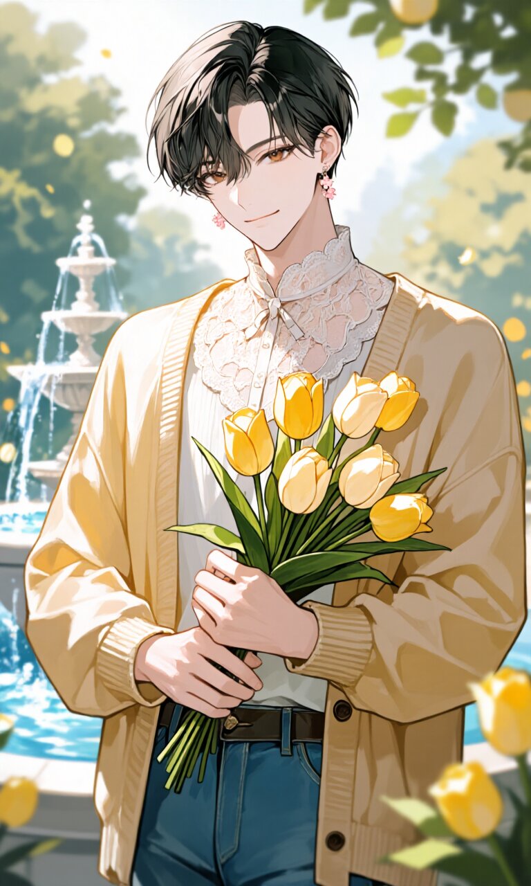 A gentle, handsome young man holding a bouquet of tulips. A breathtakingly beautiful young man—a 19-year-old Japanese boy with an innocent expression.Glasses, His soft black hair falls to the sides, revealing his forehead, and his pale, almost luminous skin reacts vividly to the light. His warm brown eyes possess a quiet depth that draws you in; his irises are mesmerizing. Long lashes cast a faint shadow beneath his eyes, framing his perfectly chiseled features. He wears a large lace collar, a pale lemon yellow cardigan, denim pants, and cherry blossom earrings. A faint smile. Spring sunlight, light reflecting off his skin, The backdrop is a beautiful fountain, suggesting a rendezvous.,