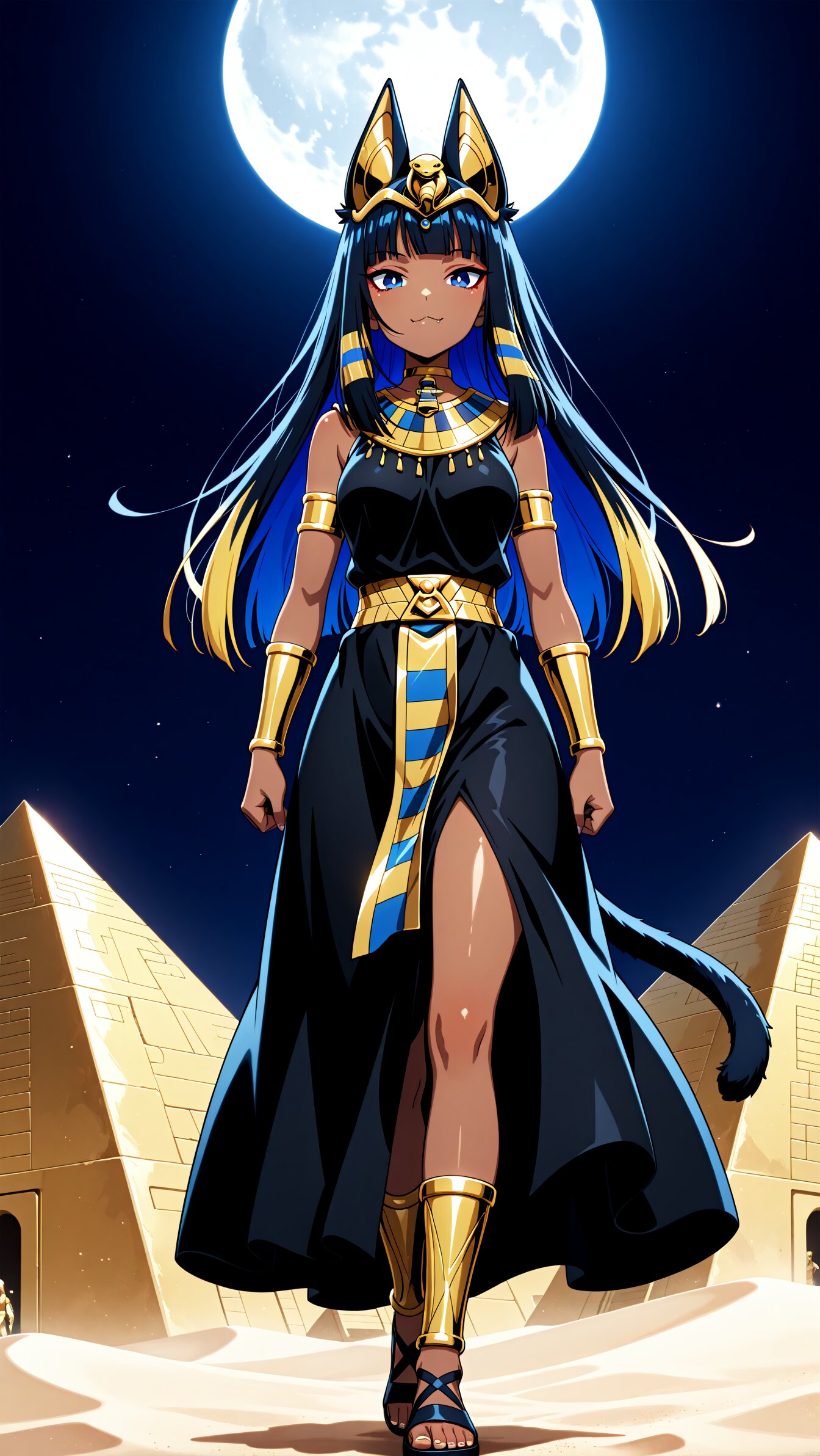 <lora:MeMax6-noob-vpred:1>,memaxl6_a,memaxl6_b,memaxl6_c,memaxl6_d,memaxl6_e, 10's anime style, Full HD, 32K, 1girl, full body, (straight-on:1.2), standing, (solo), (teenage):1.4, medium breasts, (floating hair:1.6, wind:1.8, showing forehead), (black clothes), (Kalasiris:)2.0, (ancient egyptian clothes), (ancient egyptian hat), (black long skirt), tsurime, medium breast, (sanpaku:1.1), beautiful hair, shiny hair,(multicolored hair, black hair, blue hair, blonde hair):2.0, ((long hair)), (blue eyes),(((straight hair))),(blunt bangs), shiny skin, very dark skin, cat ears, cat tail, white pupils, :3, fangs, (sand background, egyptian mythology, pyramid, full moon, dark-blue background, backlighting:1.4, high contrast:1.2), masterpiece, best quality, super fine illustration, very aesthetic, newest, hyper detailed, intricate, beautiful, aesthetic, highly decorative, HDR, yume kawaii, ,anime screencap, anime, no gradients, 2D flat design, bold outlines,