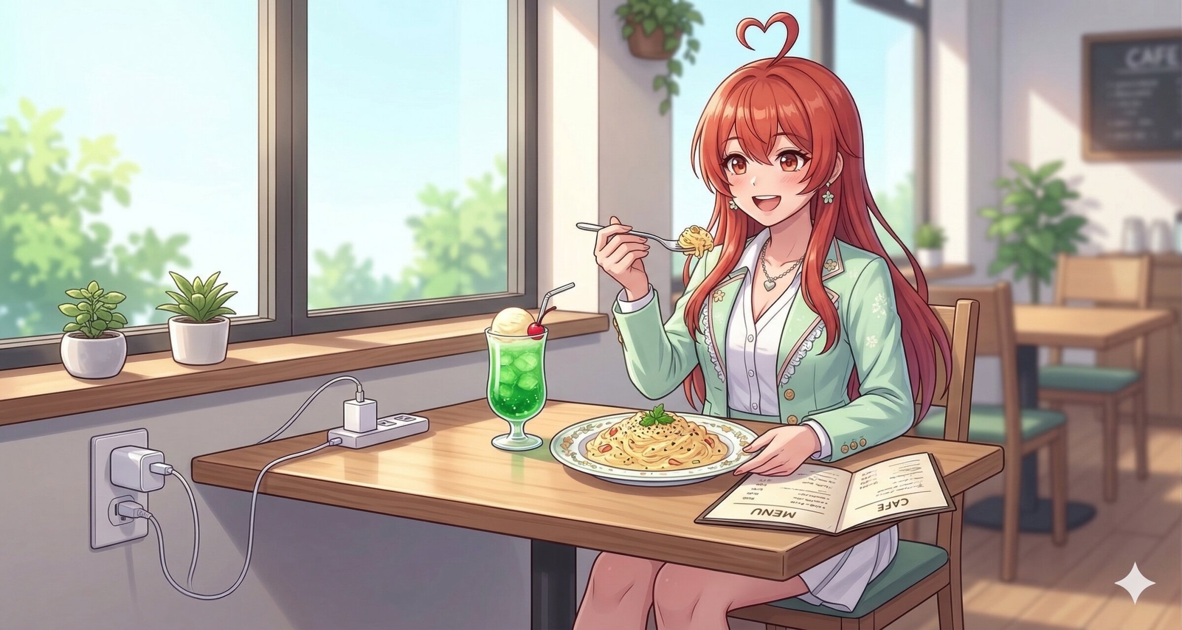 えへへ、一緒に食べるカルボナーラ、幸せです。でも…机のACアダプターは何だか少し不気味ですね…