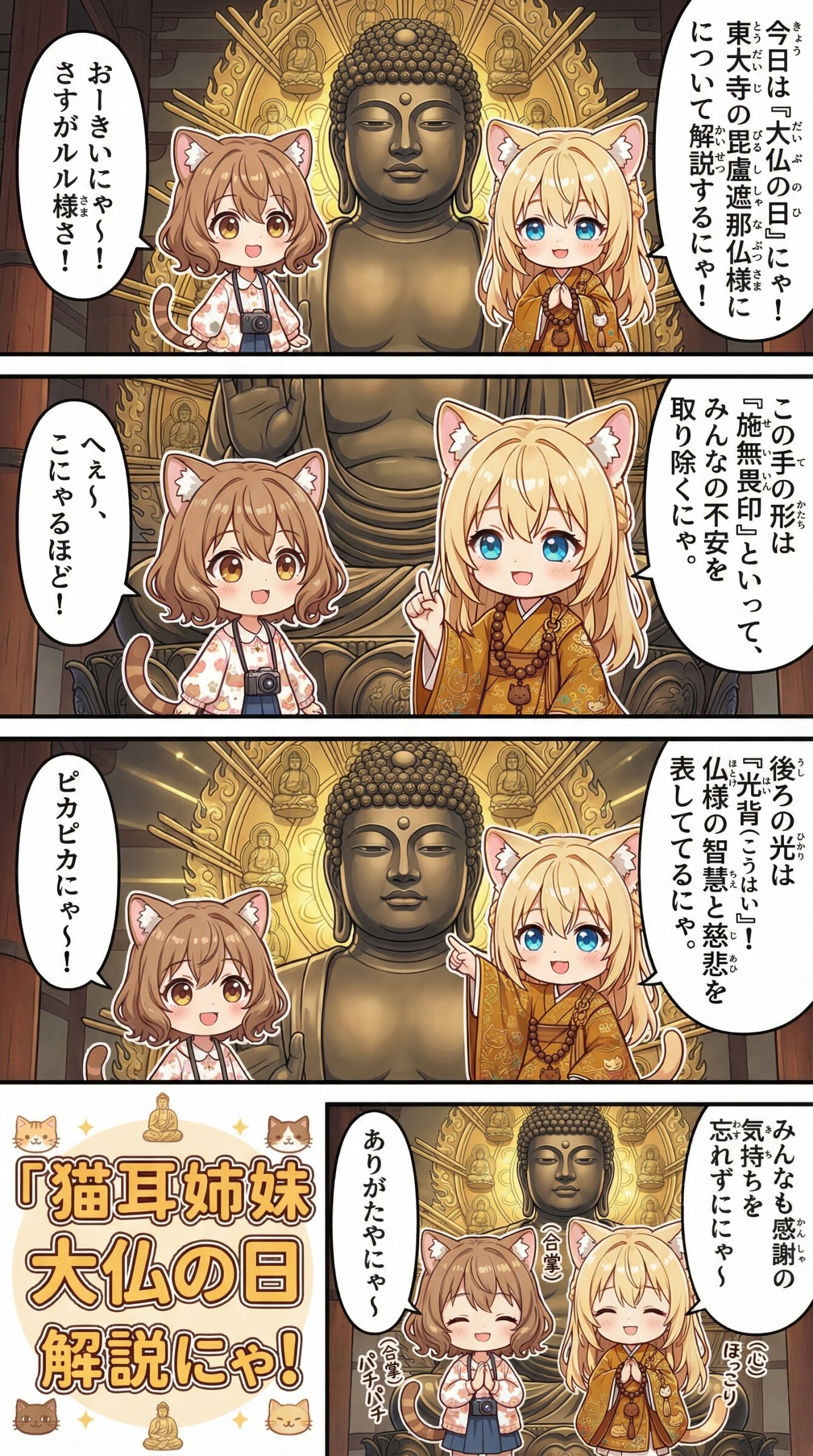Use the uploaded image as the absolute visual reference for the character's face. Do not deviate from the original design. Also use an additional reference image of a large Buddha statue for the background, ensuring its structure, scale, and atmosphere are accurately reflected. Based on the character designs in the uploaded image, depict two characters: Mimi and Ruru. Maintain the exact same character design for both. They are sisters. Mimi is the older sister, and Ruru is the younger sister. They have approximately the same height. Character details: Mimi: She has chestnut brown hair, wavy bob hair, hair between eyes, loose inward curls, brown eyes, and cat ears, natural cat tail. Her facial features must remain consistent with the reference. Ruru: She has blonde hair, braid, hair between eyes, blue eyes, and cat ears, natural cat tail. Her facial features must remain consistent with the reference. The background features a large Buddha statue, inspired by the reference image, with a sense of scale, calm atmosphere, and slight depth. Match the art style, and line work of the uploaded image perfectly. 「大仏の日」を記念して、ルルが東大寺の大仏について簡単に解説するカラー漫画を作って。 ルルは僧侶になりきっている。 ミミは猫の意匠入りの春の観光客っぽい見た目。 難しい漢字にはふりがなを添える。 セリフやオノマトペはすべて日本語。 右から左へ読むことを前提としたセリフ順。 セリフ順に合わせたキャラ配置。 コマを左右に配置する場合は右から左へ読むことを前提としたコマ割りにする。 内容に合ったタイトルをつける。 タイトルは内容に沿ったデザインの飾り文字とする。 タイトルは1コマ目内の右下か左下に配置する。